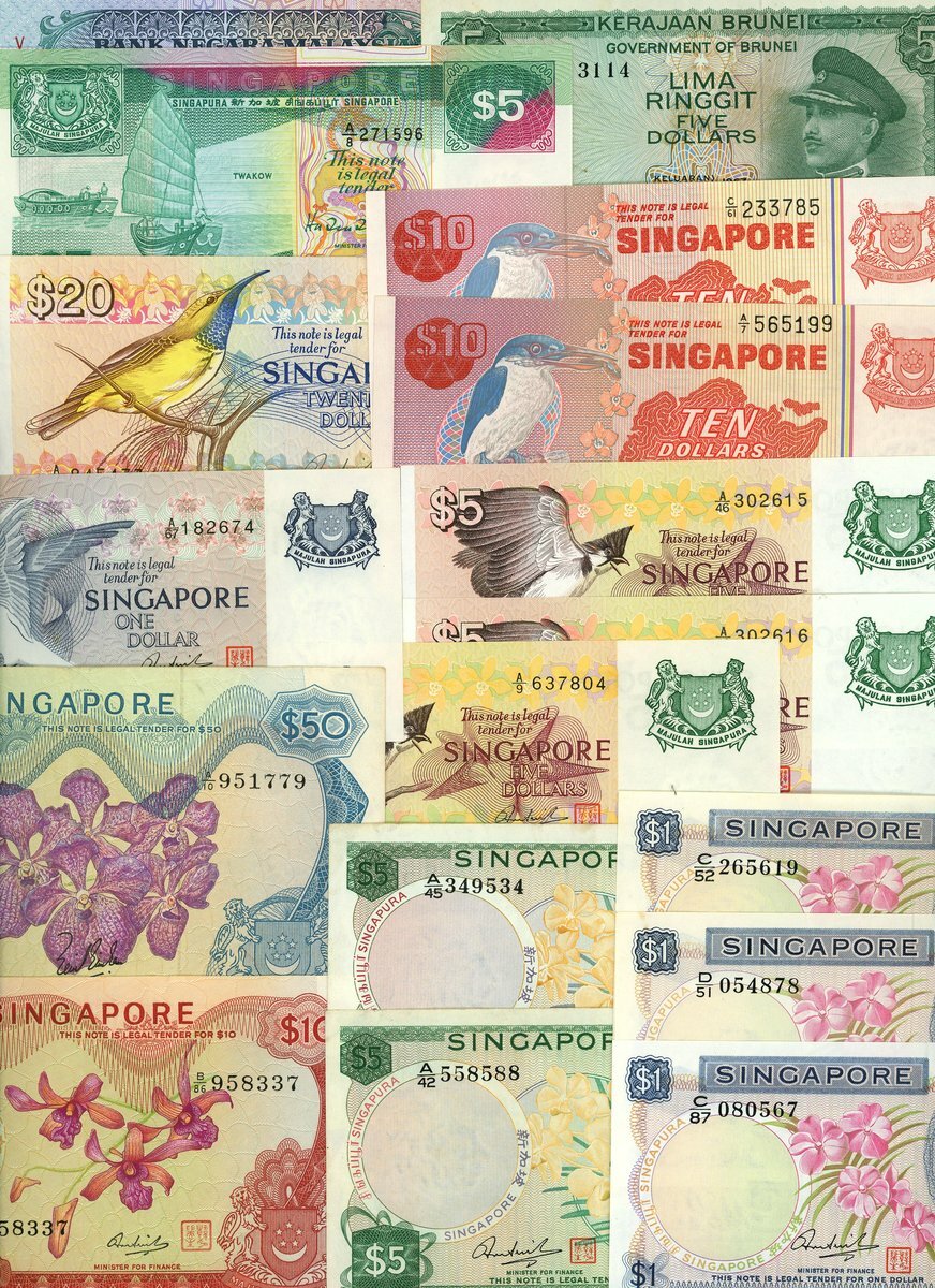 (x) Board of Commissioners of Currency Singapore, including $1 (3), $5 (2), $10, $50, 1967-73, $1, $5 (3), $10 (2), $20, 1976-80, $5 (3), $10 (3), also a Brunei $5, Malaysia $50,
