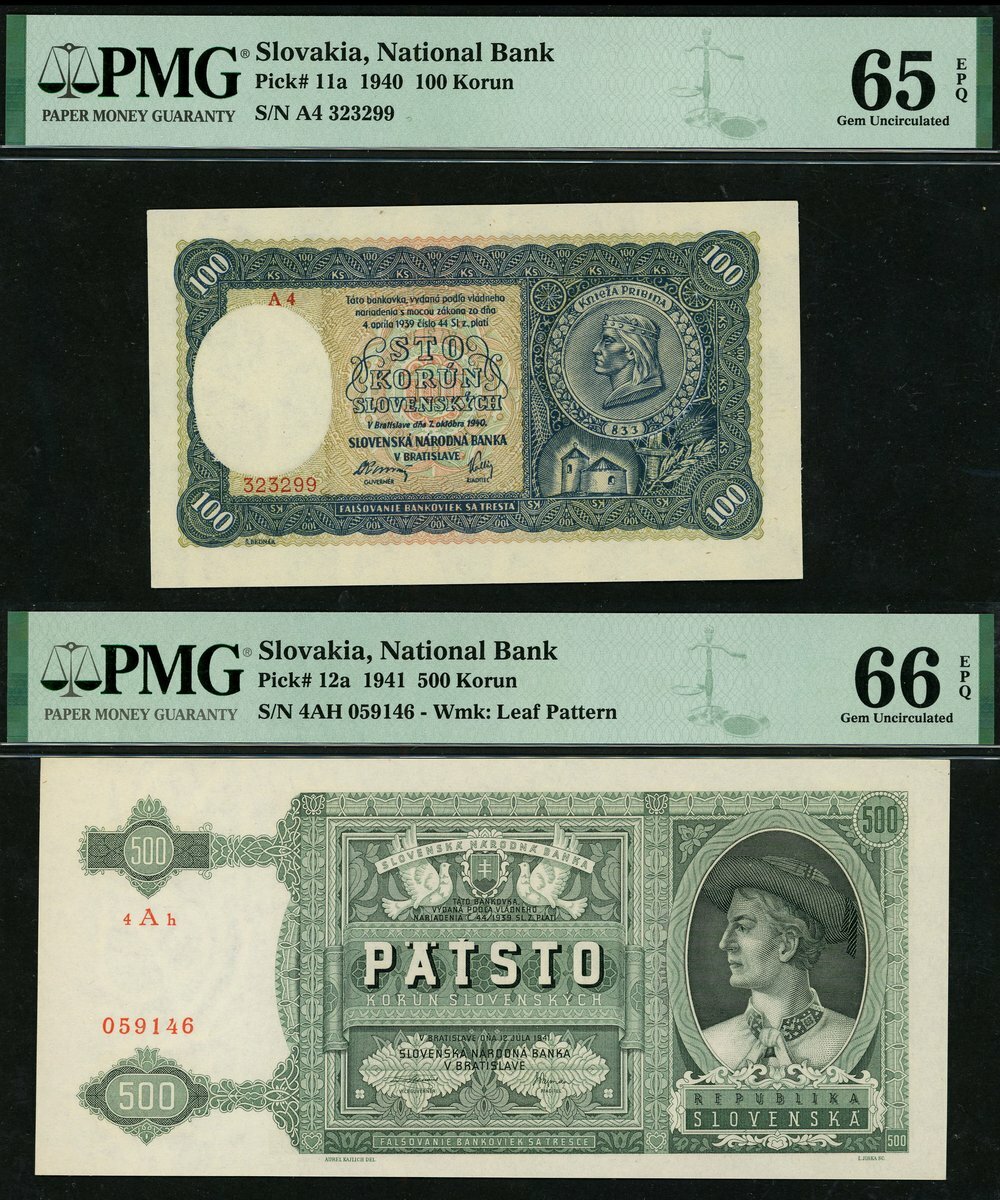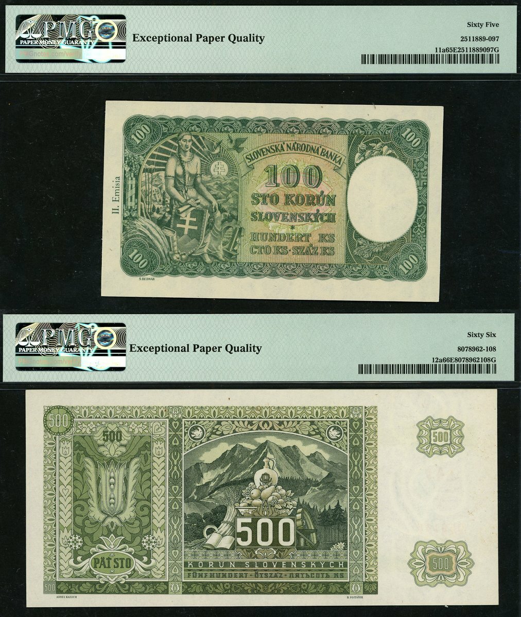 (x) National Bank, Slovakia, 100 korun, 1940, also 500 korun, 1941