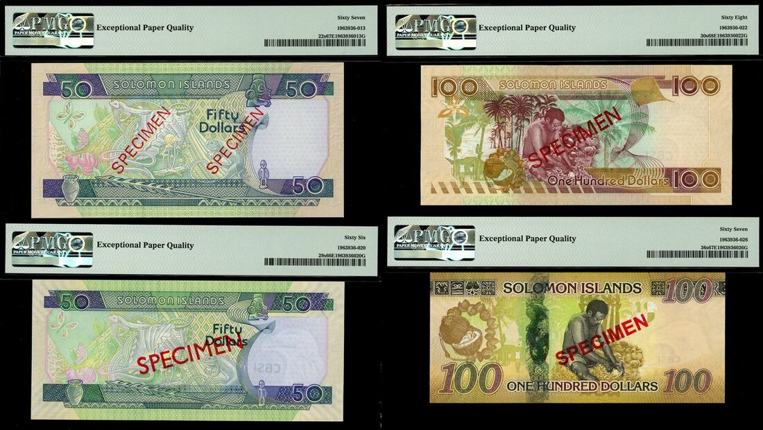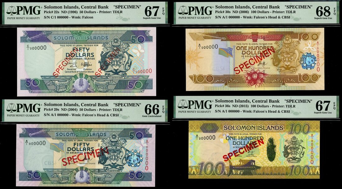 (x) Solomon Islands, specimen $50 (2), 1996, 2004, also specimen $100, 2006, 2015 (Pick 22s, 29s, 30s, 36s), in PMG holders 67, 66, 68 and 67, all are EPQ (4)