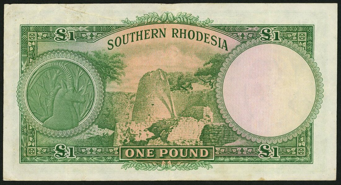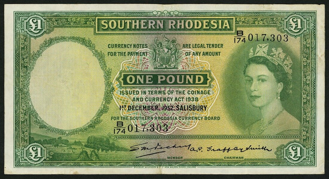 Southern Rhodesia Currency Board, £1, 1 December 1952, serial number B/174 017303, green and orange and lilac, Elizabeth II at right, arms top centre, value at centre and at each corner, Melsetter farming scene at low left, Fleming and Grafftey-Smith signatures, reverse green, lilac and orange, Great Zimbabwe ruins at centre, antelope head at left