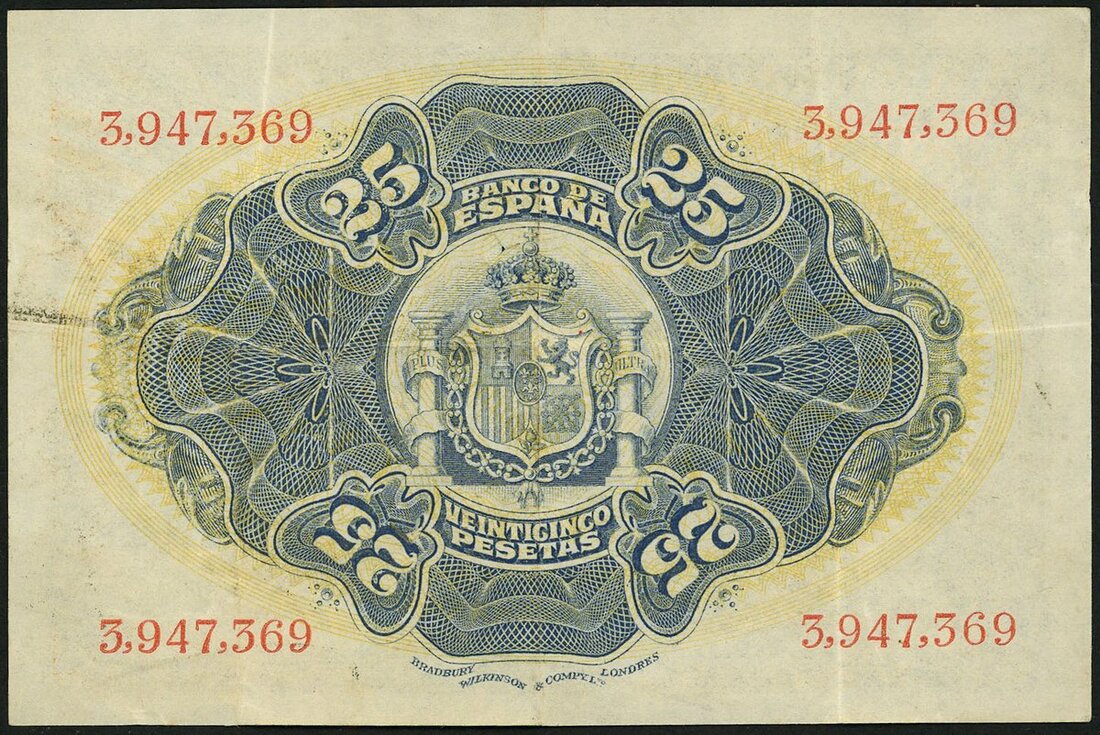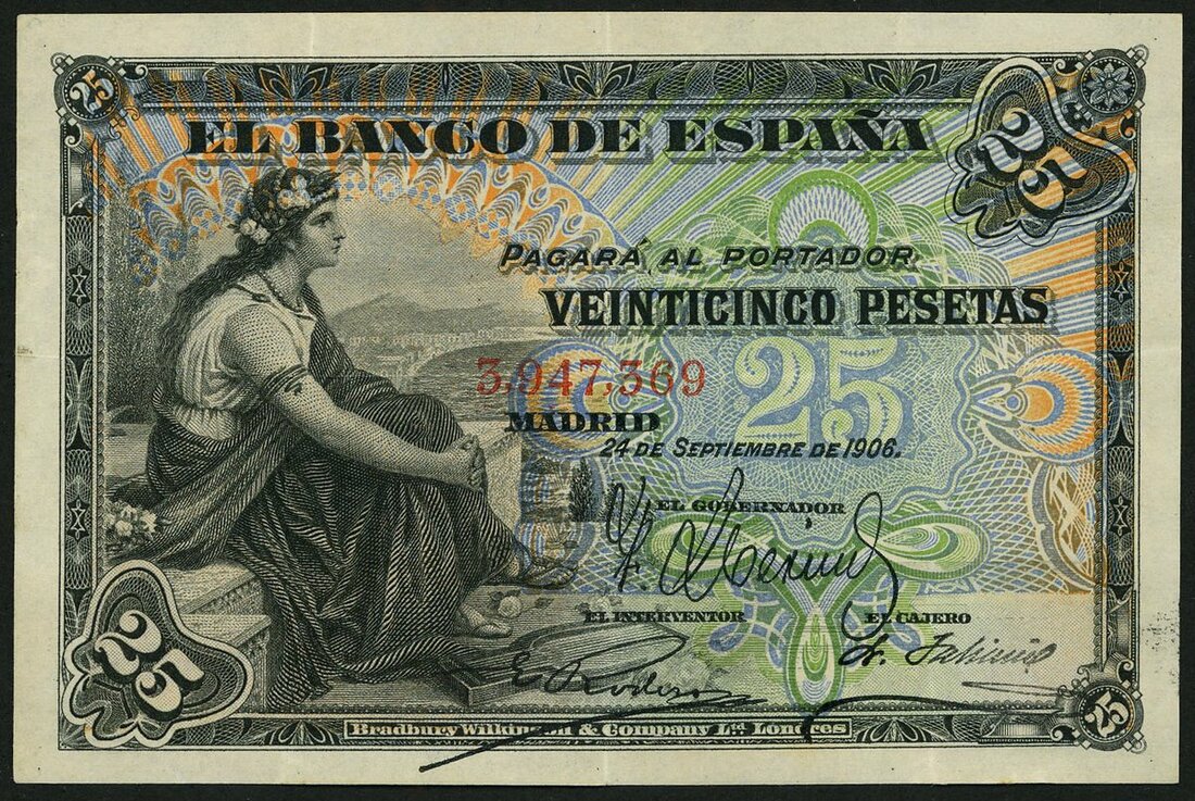 (x) El Banco de Espana, 25 pesetas, 1906, blue and multicoloured, maiden seated at left