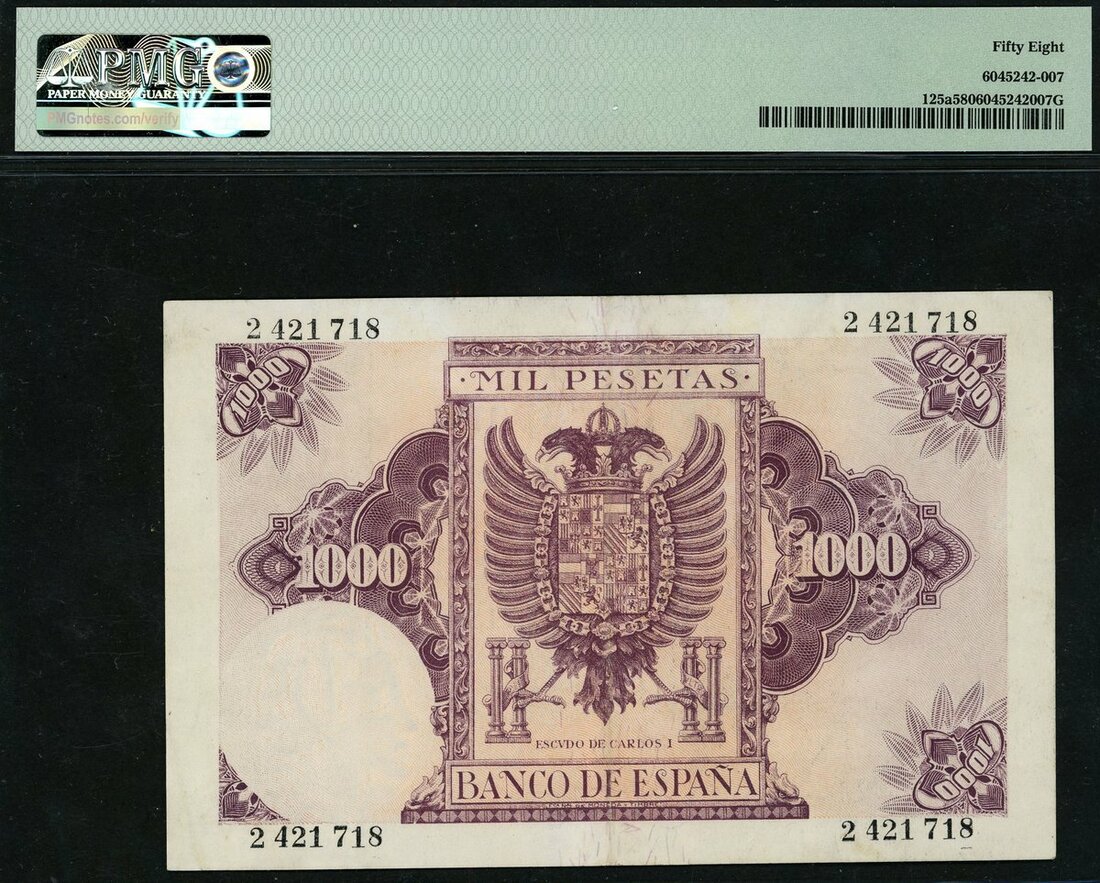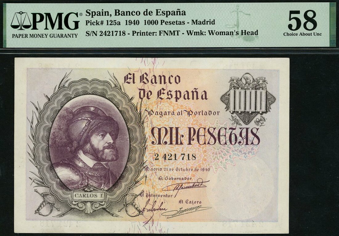 (x) Banco de Espana, 1000 pesetas, Madrid, 21 October 1940, (Pick 125a, TBB B591a), in PMG holder 58 Choice About Uncirculated