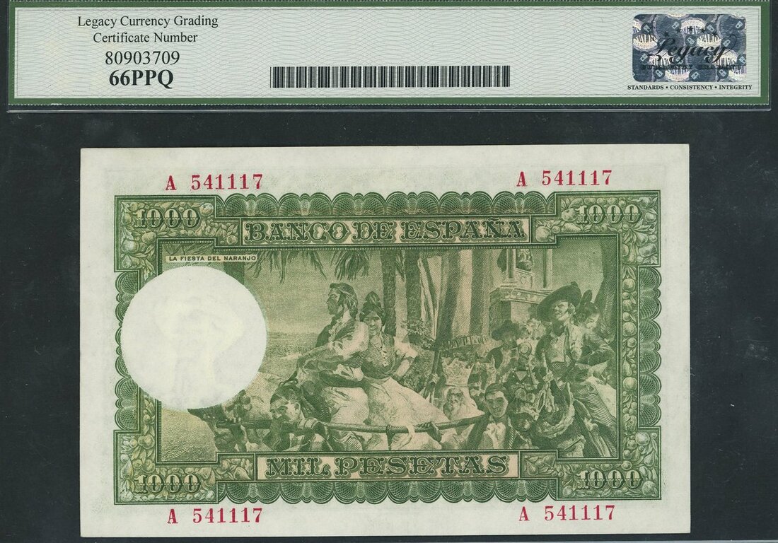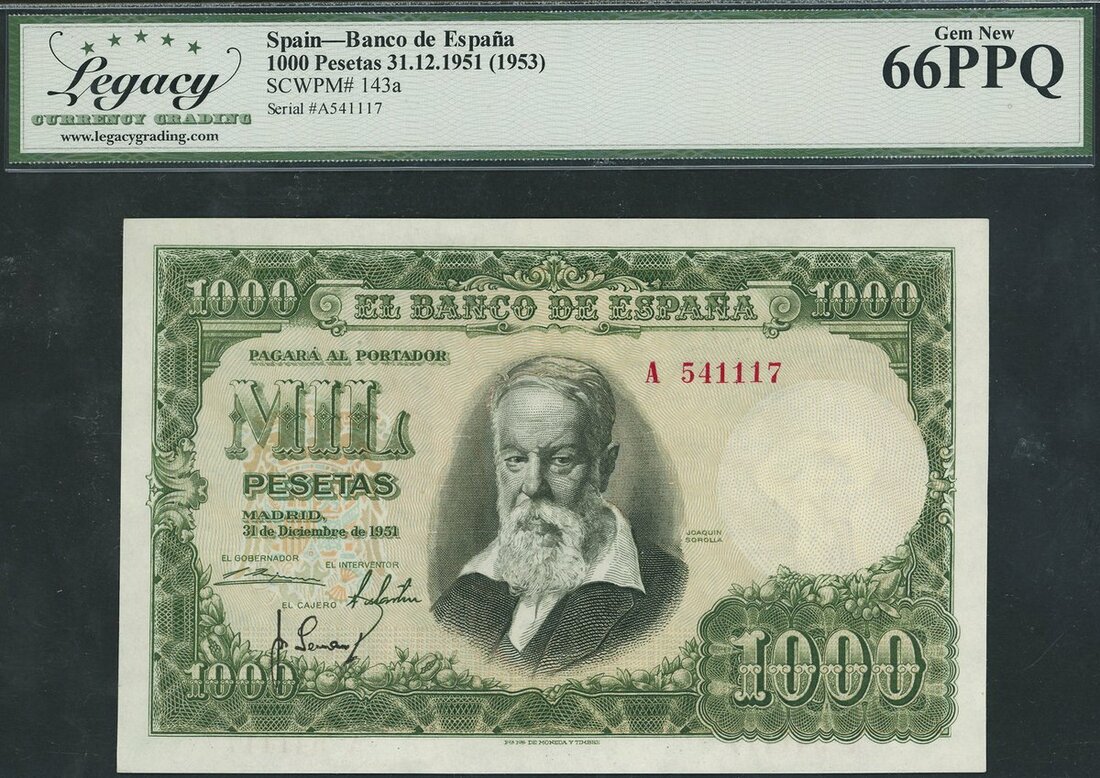 (x) El Banco de Espana, 1000 pesetas, 1951, red prefix A, green, Corolla at centre