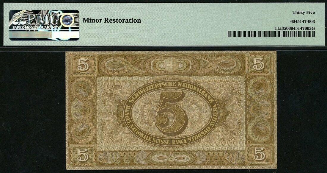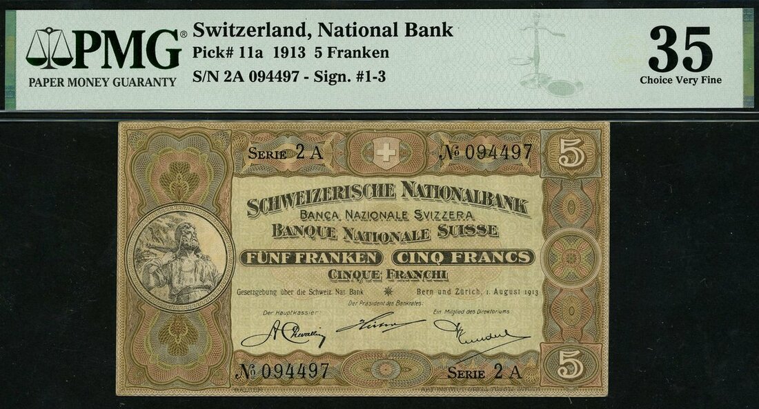 (x) Schweizerische Nationalbank, 5 franken, 1 August 1913, serial number 2A 094497, (Pick 11a, TBB B305a), Sole top grade examples in PMG Census, one of two examples. In PMG holder 35, minor restoration, Choice Very Fine. A rare first date example in a pleasing grade