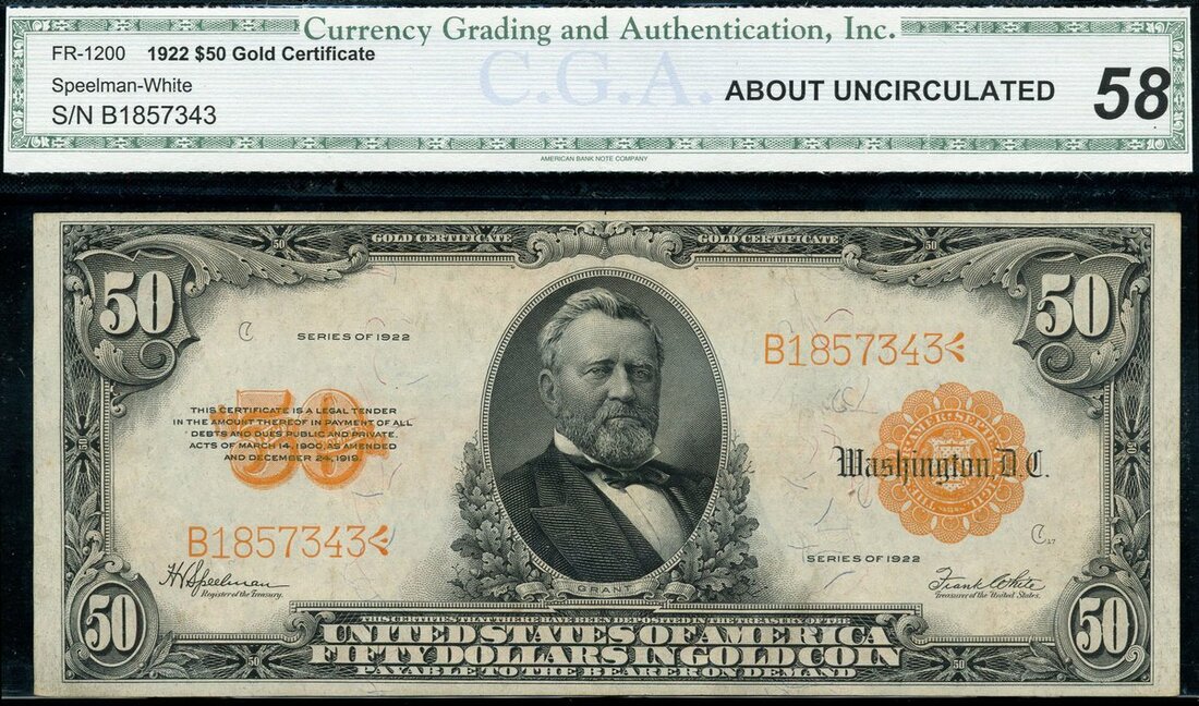 (x) United States, Gold Certificate, $50, 'Series of 1922', serial number B1857343, black on orange underprint, Ulysses S. Grant at centre, signature Speelman-White