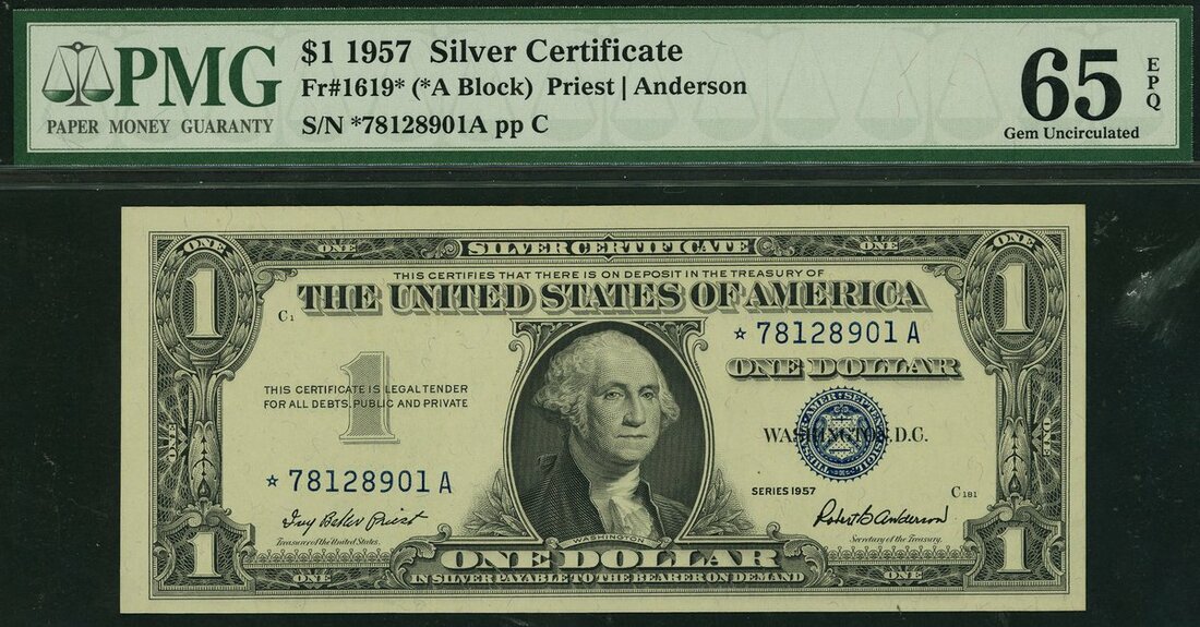 (x) United States of America, Silver certificate, $1, 1957, A block, Washington at centre, Priest and Anderson signatures
