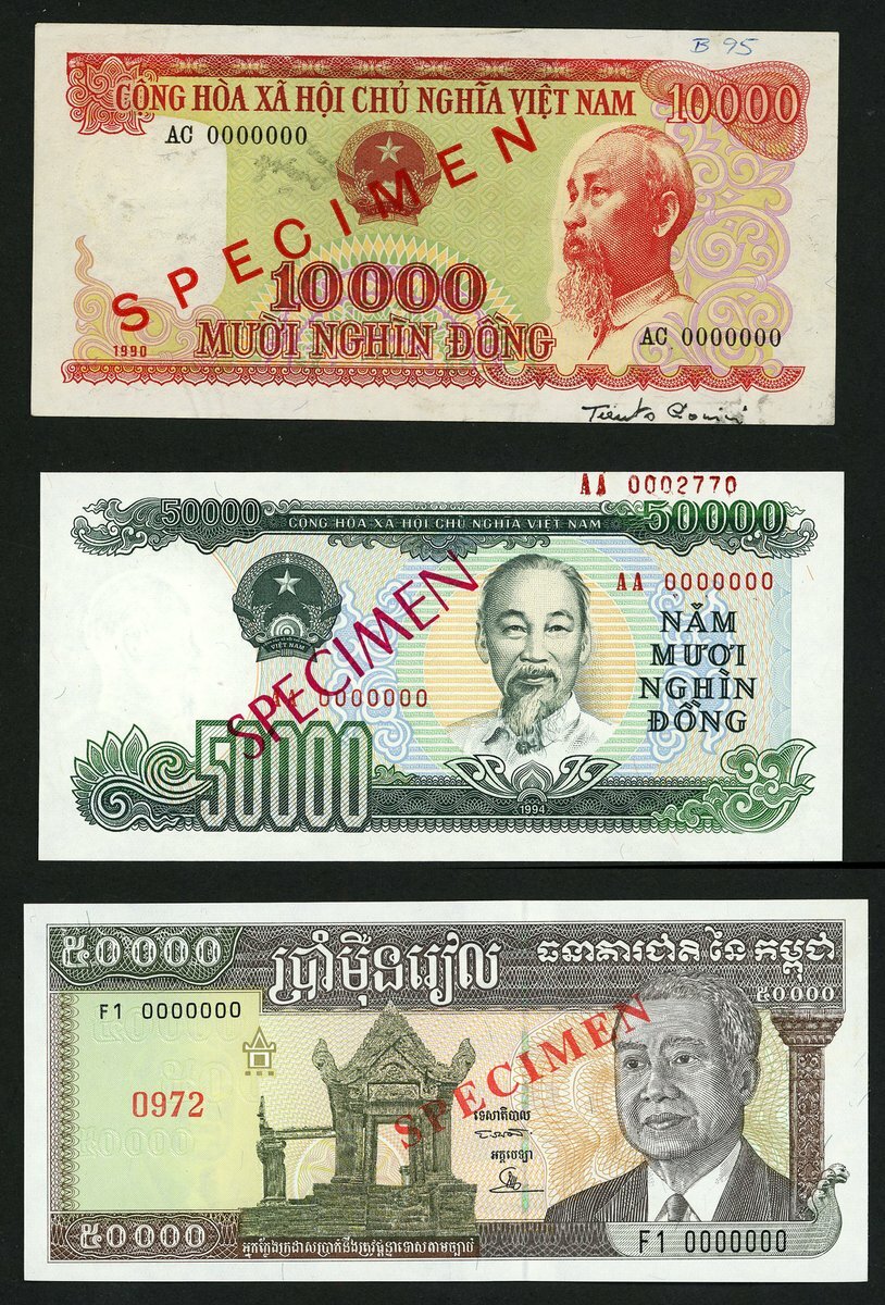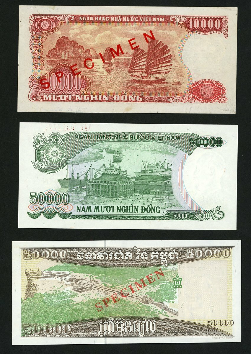 (x) National Bank of Vietnam, specimen 10,000 dong, 1990, also a specimen 50,000 dong, 1994, and Cambodia, specimen 50,000 reis,