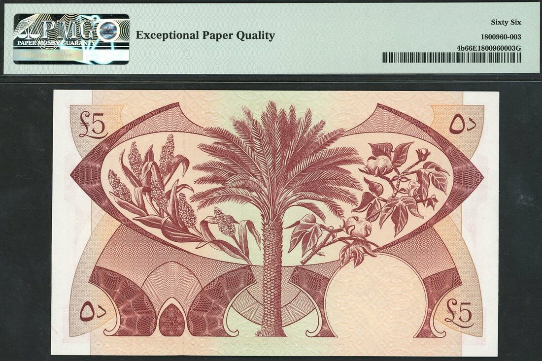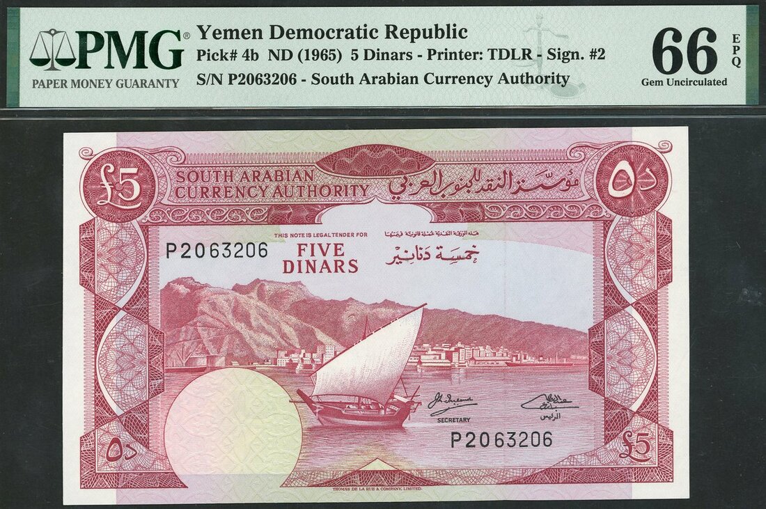 (x) Democratic Republic of Yemen, 5 dinars, ND (1965), prefix P, red, boat at centre