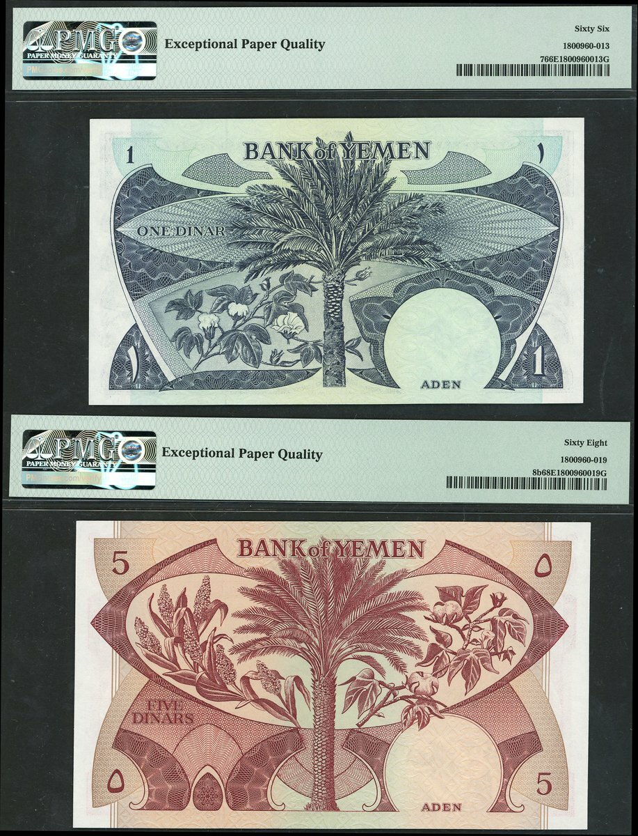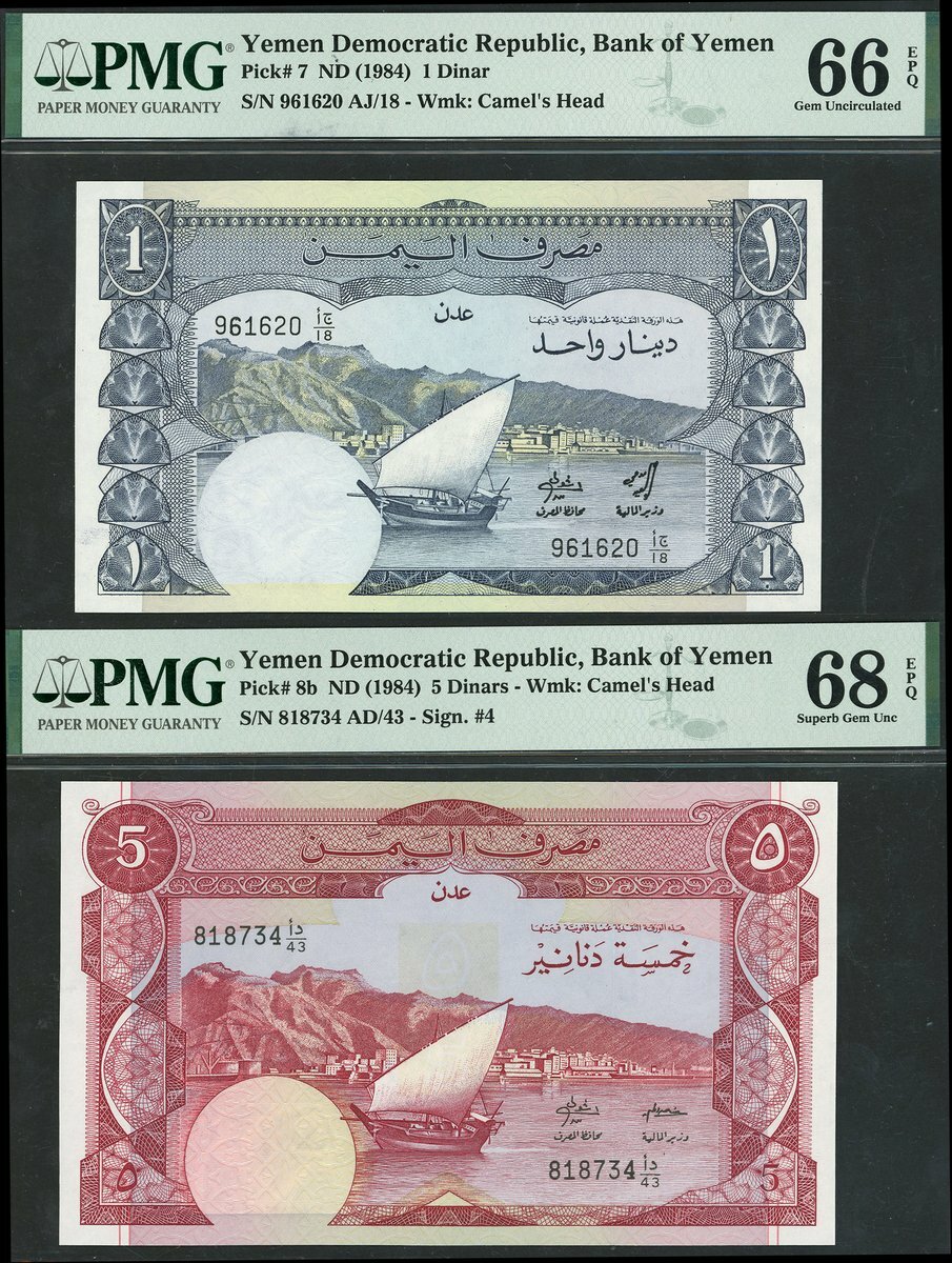 (x) Democratic Republic of Yemen, 1 dinar, blue and 5 dinars, red, both ND (1984), boat at centre