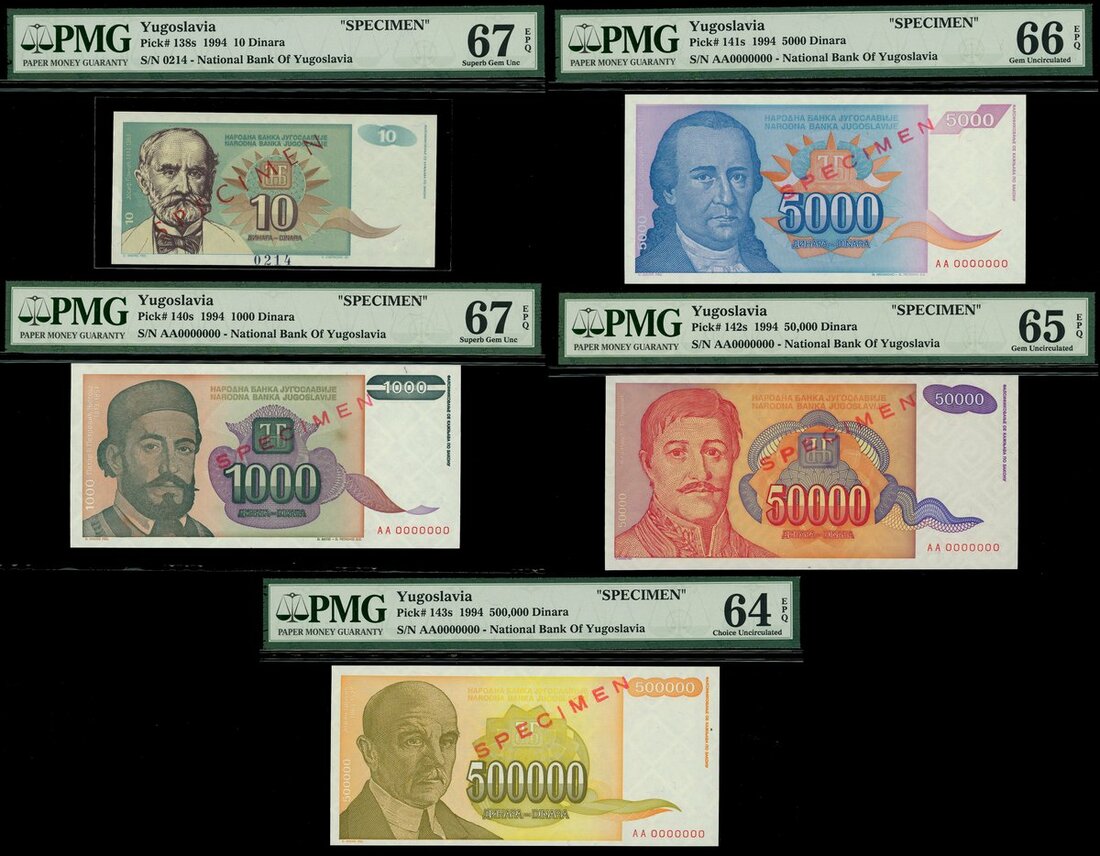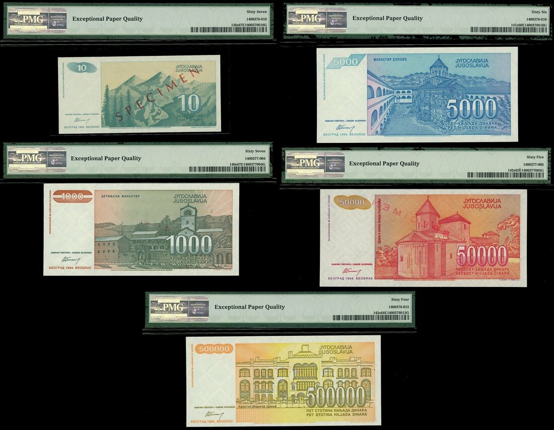 National Bank of Yugoslavia, specimen 10 dinara, 1000 dinara, 5000 dinara, 50000 dinara and 500000 dinara, 1994, first handstamp number 0214, balance all red serial number AA 000000 pale green, orange and lilac, blue and orange, red and orange, orange and green respectively