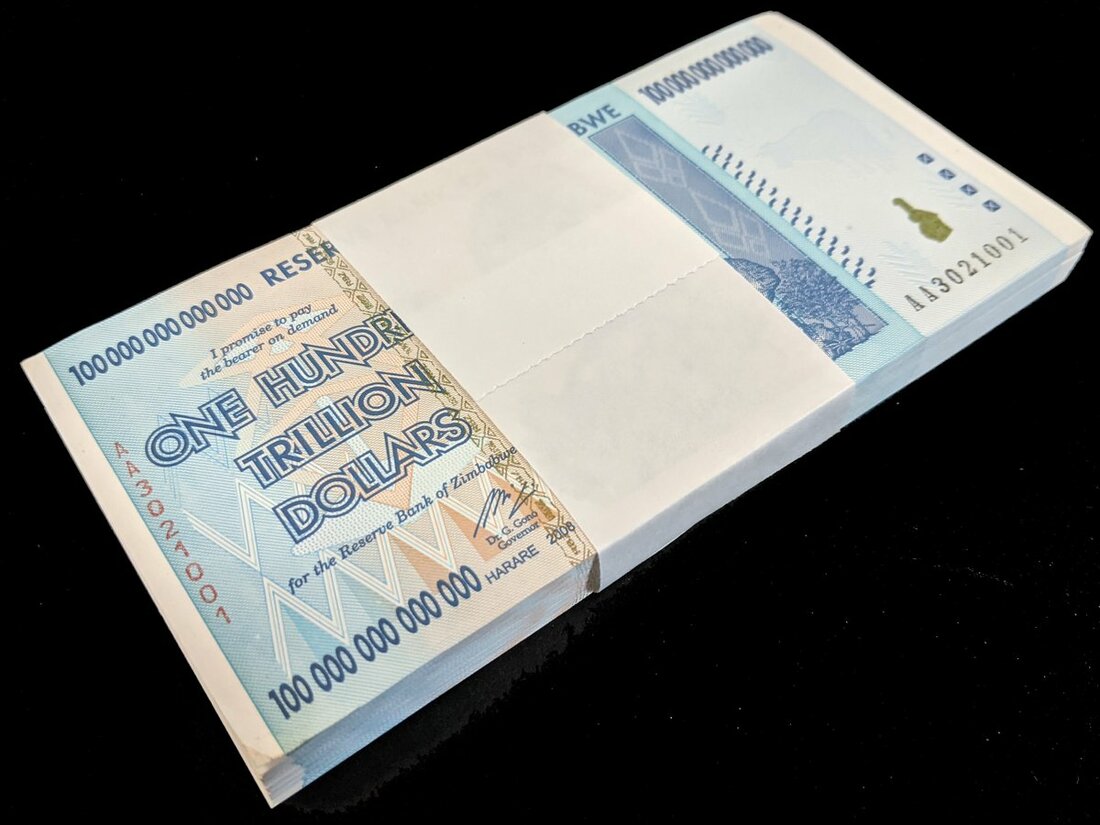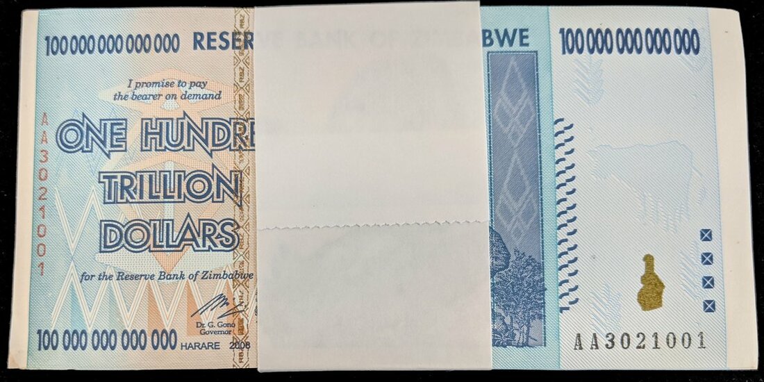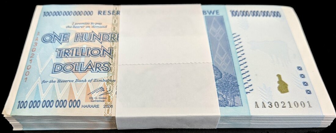 (Pick 91, TBB B182a), light darkening in the upper left edge, about uncirculated to uncirculated, a famous modern example of hyperinflation (using Cagan's definition began in February 2007), with peak of inflation estimated 7936 billion percent month-on-month, 89.7 sextillion percent year-on-year in mid-November 2008, an interesting fact - if one banknote of this denomination would be split to 10 dollar bills then stacked up on top of each other it would easily reach to the moon and back, important piece of economic history (100 notes)