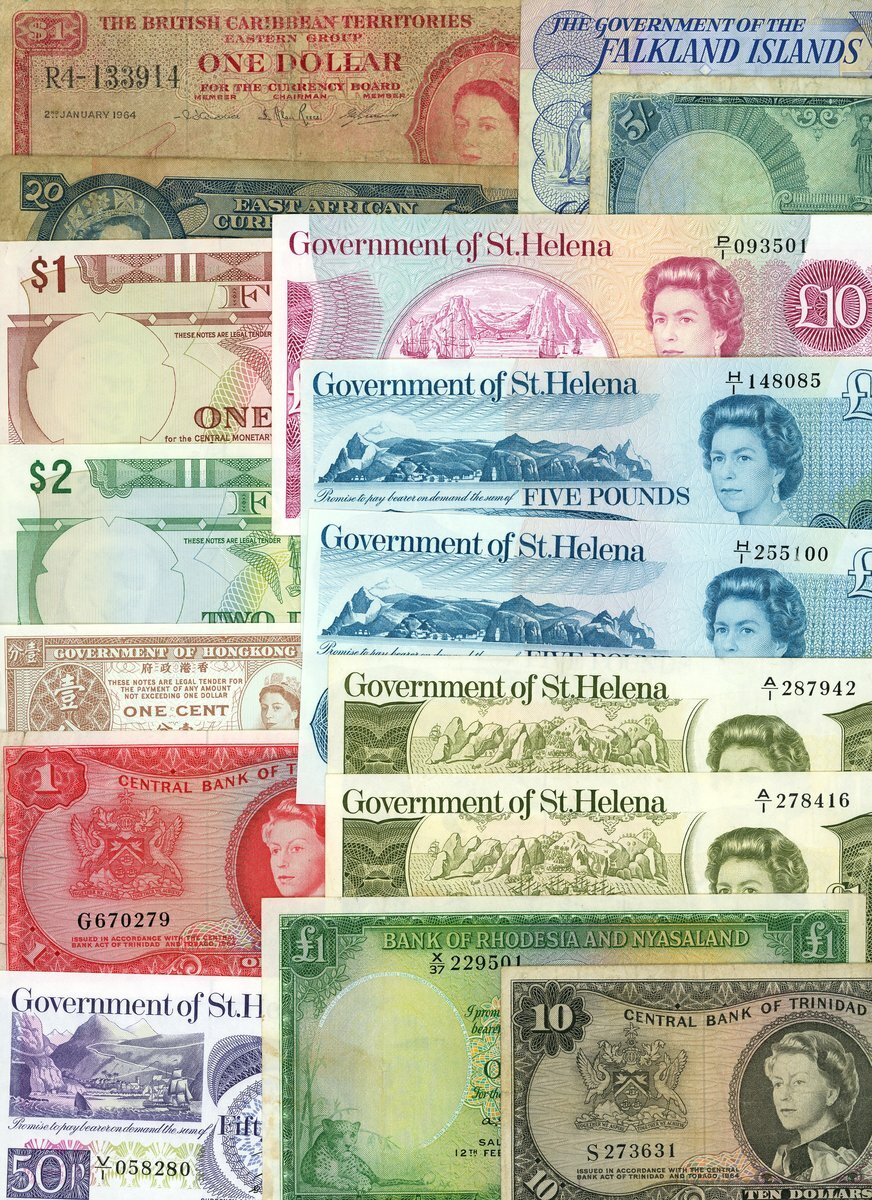 A group of Queen Elizabeth II notes, including Bahamas, British Caribbean Territories (2), British Honduras, Canada (16), East Africa (4), Falkland Islands (4), Hong Kong (3), Jamaica (2), Mauritius, Rhodesia and Nyasaland (2), Saint Helena (6), Trinidad and Tobago (2) includes a 1964 $10,