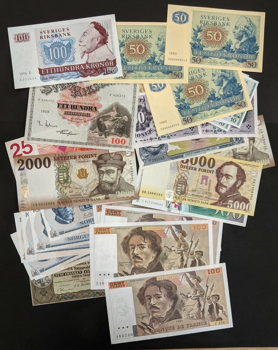 (x) A group of European banknotes, British Armed Forces, Denmark (4), France (5), Hungary (3), Netherlands, Norway (9), Poland, Spain, Sweden (11), Switzerland,