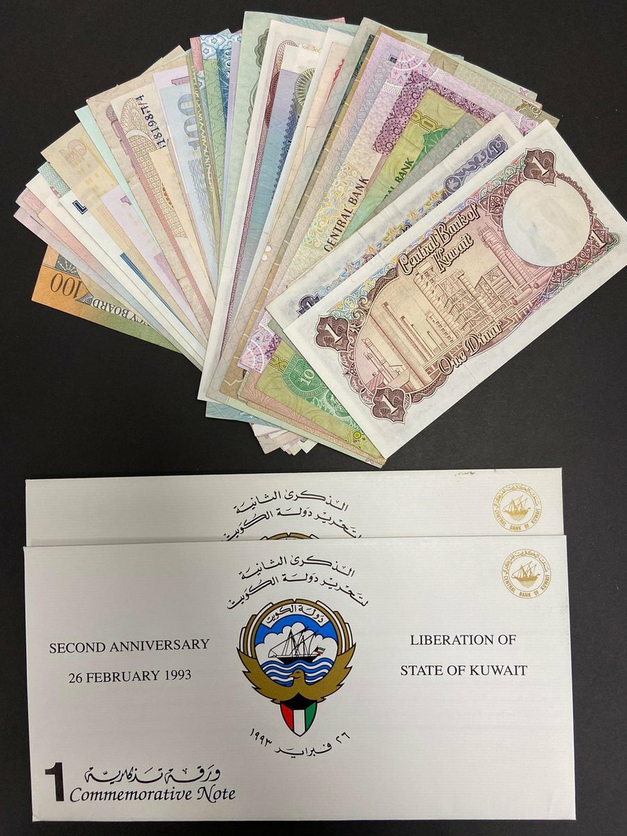 A group of Middle East banknotes, including Bahrain (6), Iran (14), Iraq (22), Israel (16), Jordan (2), Kuwait (12), Lebanon (7), Oman (7), Qatar/Qatar and Dubai (3), Saudi Arabia (12), Syria (7), Tripolitania, United Arab Emirates (2), Yemen (4),
