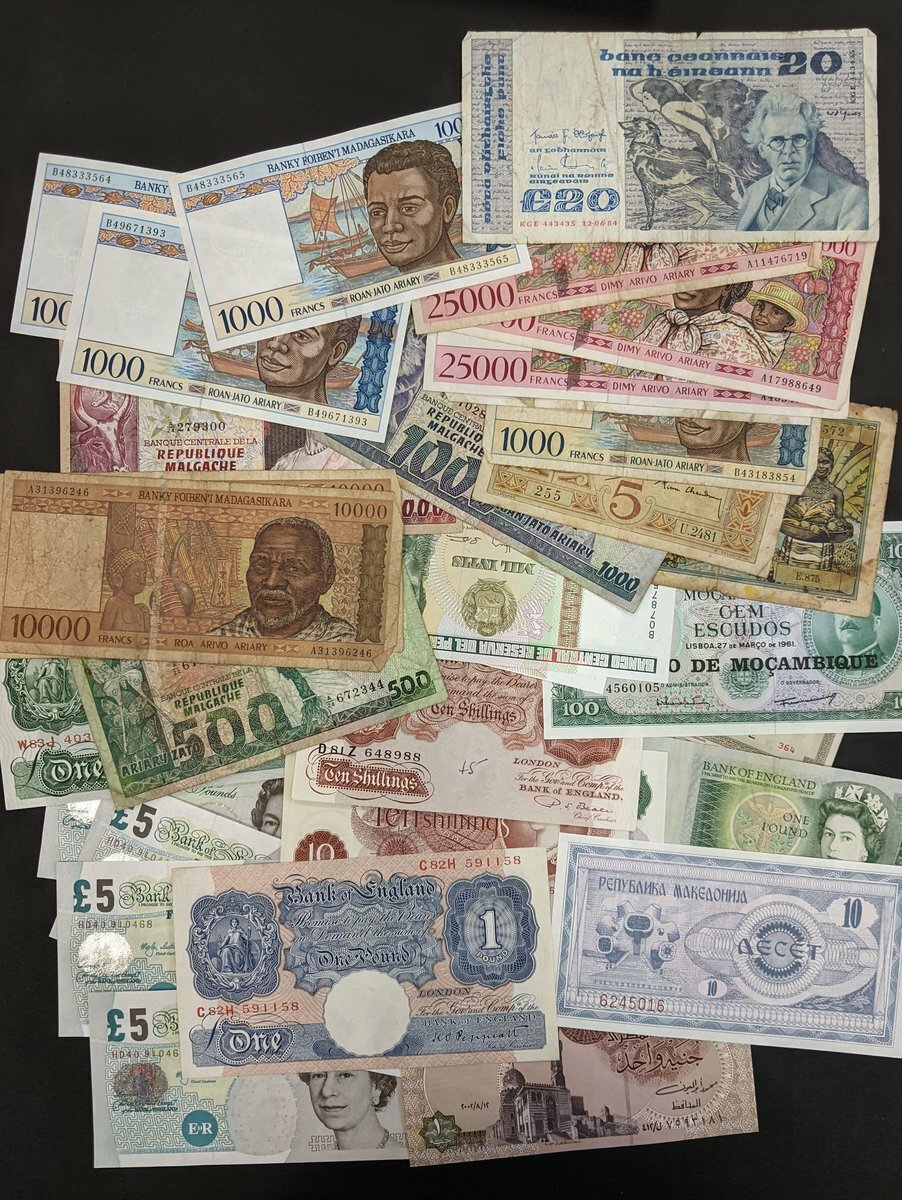A miscellaneous group of world currency, mostly French colonial, also £5 (4) with prefix HD40, a Bank of Ireland £20, three Scottish £1, a blue Peppiatt £1 and a Britannia Beale 10 shillings