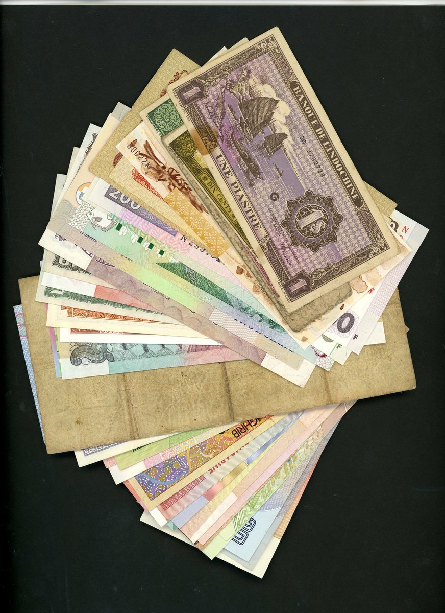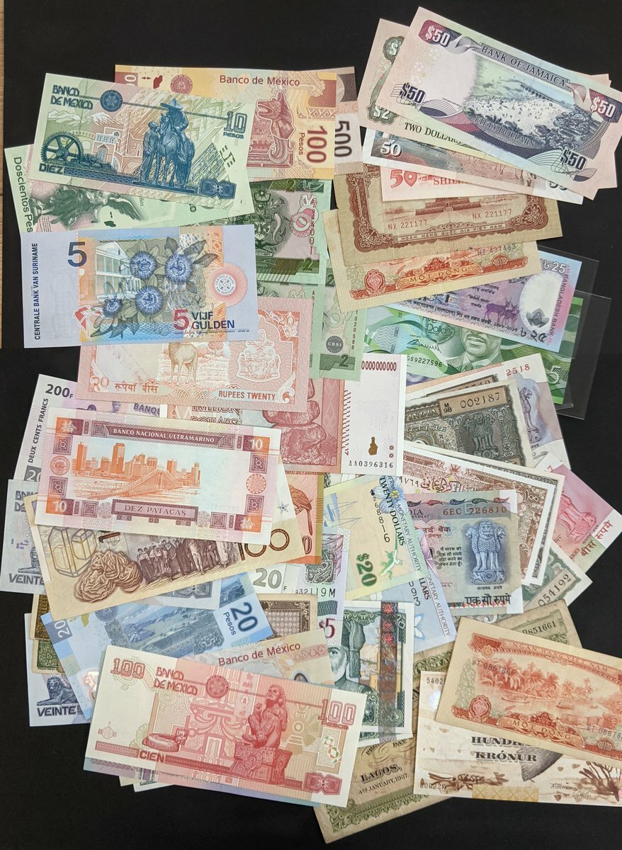 Mixed world notes, consisting of, Suriname (2), Vietnam (3), West African Currency Board (1), Indochina (4), Macau (1), Tanzania (1), Congo (2), Kenya (1), Morocco (1), Zimbabwe (1), Mexico (9), Jamaica (2), Oman (3), Bermuda (2), Bangladesh (1), Solomon Islands (4), Barbados (1), Belize (1), East Caribbean (1), Faroe Islands (1), Nepal (1), Sri Lanka (1), India (6), China (1)
