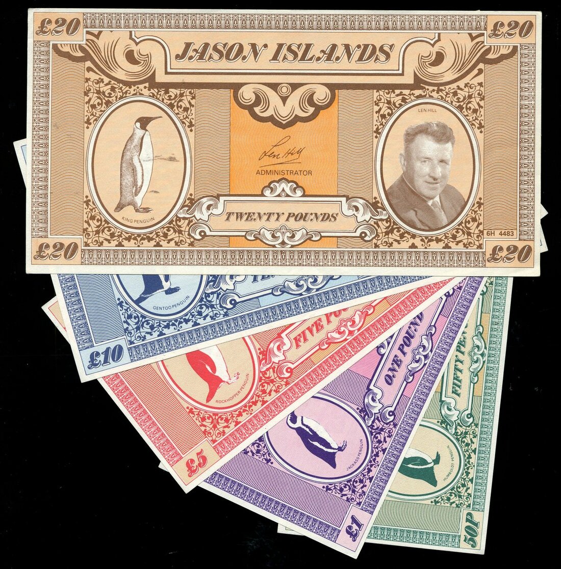 Jason Islands, bird sanctuary, Len Hill issued private currency comprising 50pence, £1, 5, 10 and 20 various colours, all portrait of Len Hill and a penguin