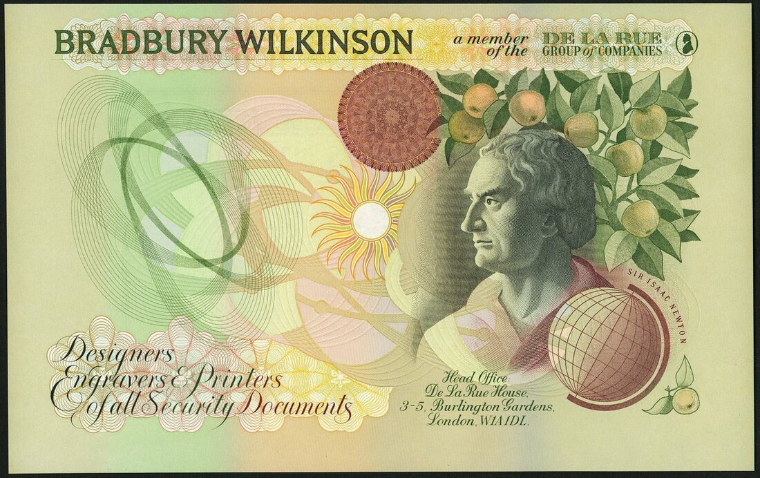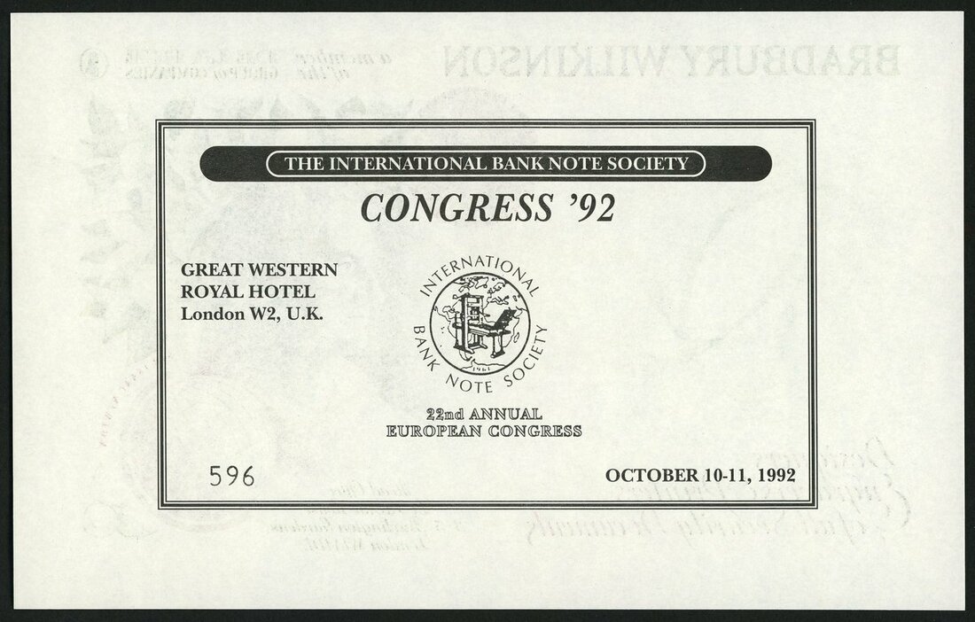 Bradbury Wilkinson, Promotional Banknote, October 10-11 1992, number 596, portrait of Sir Isaac Newton, reverse The International Bank Note Society Congress 92,