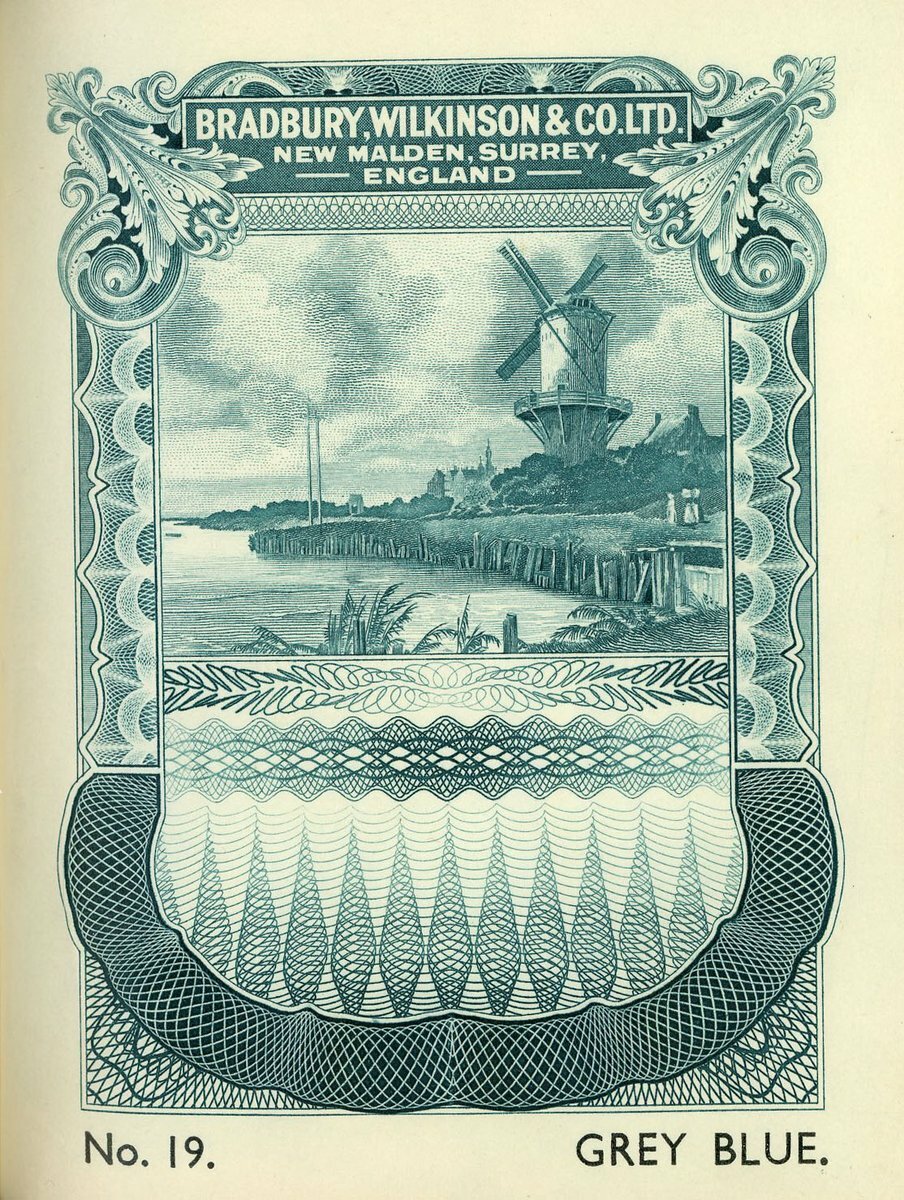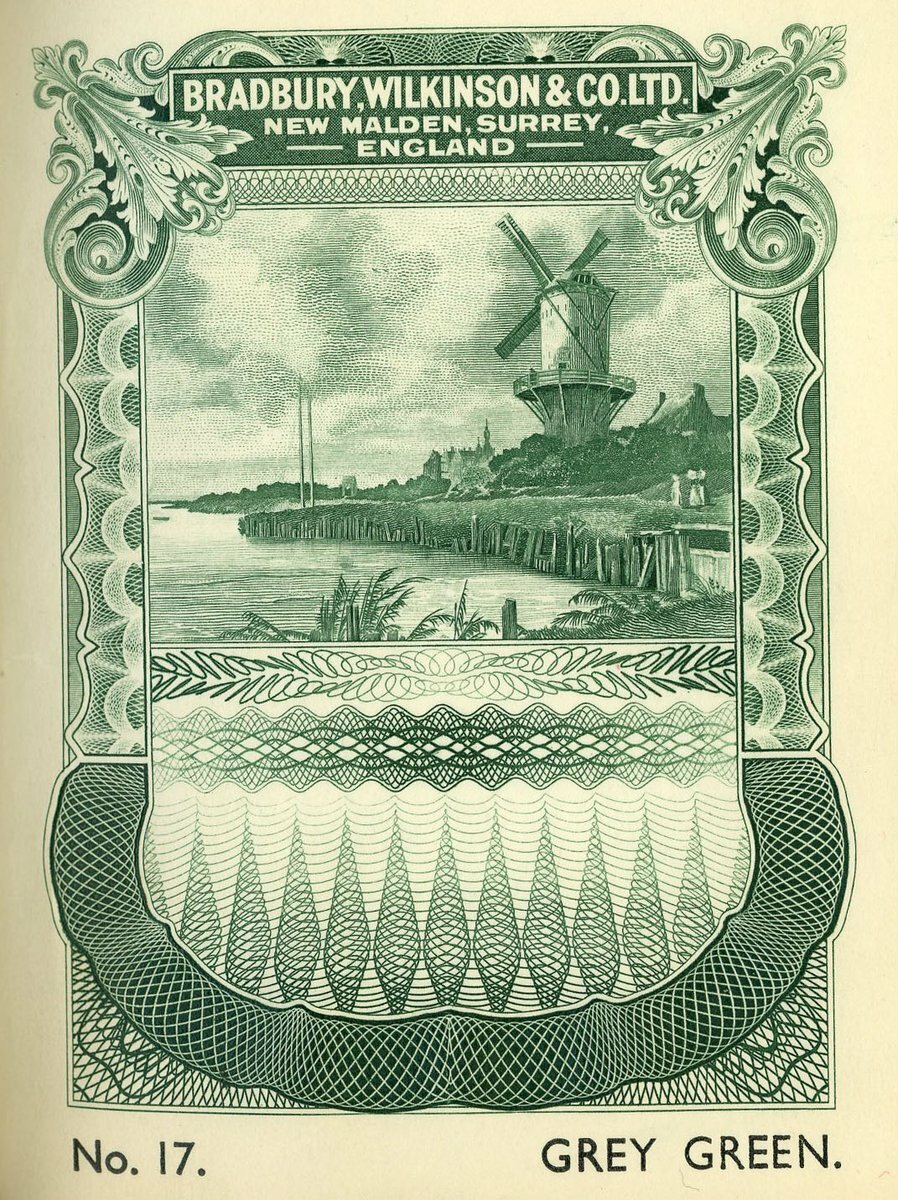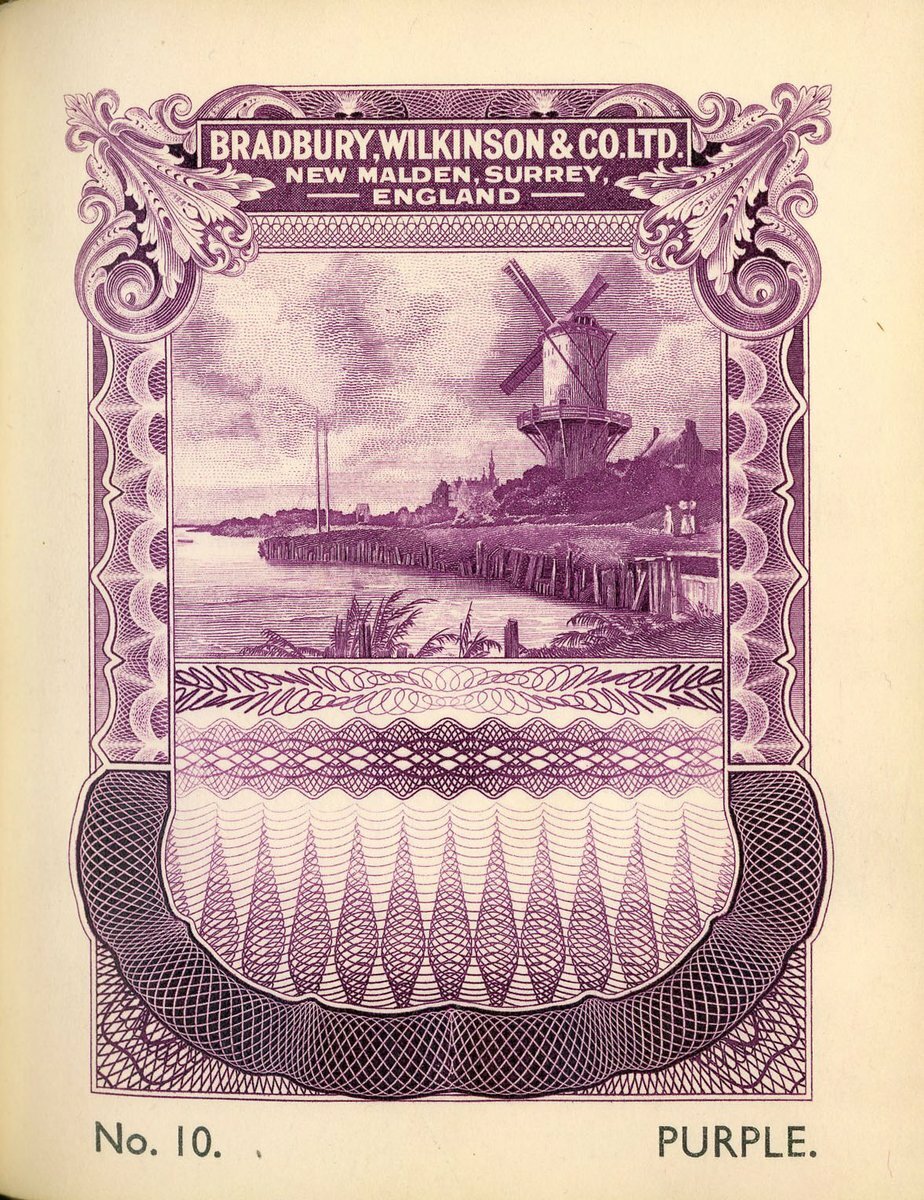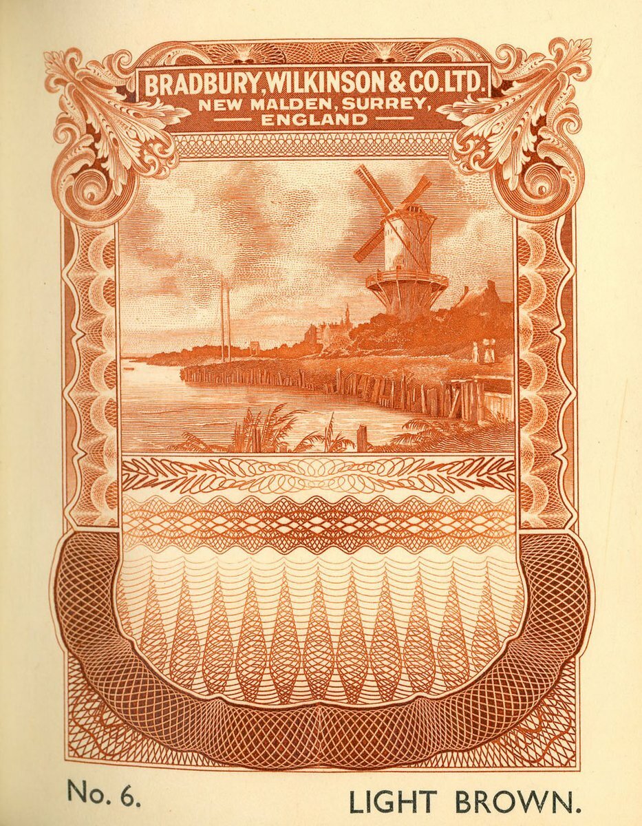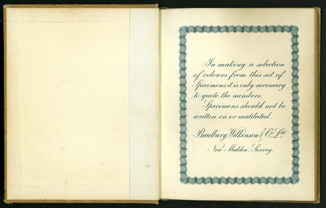 Bradbury Wilkinson & Co. Ltd, a brown hardbound booklet entitled Plate Colour Chart, 1957, featuring 25 pages in different colours, each with a vignette of a riverbank and windmill at upper centre and an ornate border, with each page labelled with a number and colour name,