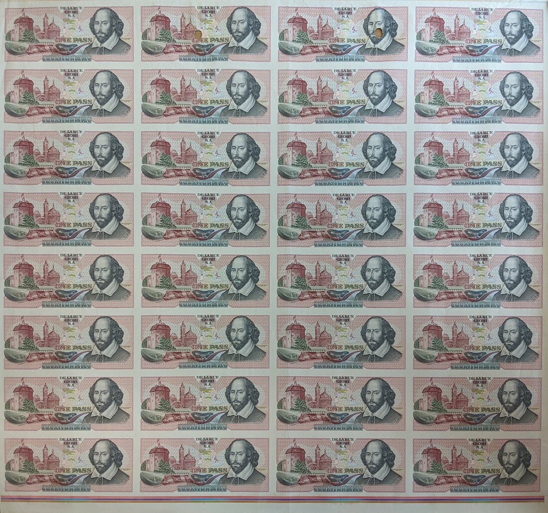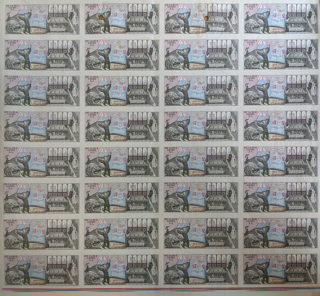 (x) De La Rue Giori S. A. a sheet of 40 1 pass completa test note, two notes hole punched, some handling, good extremely fine