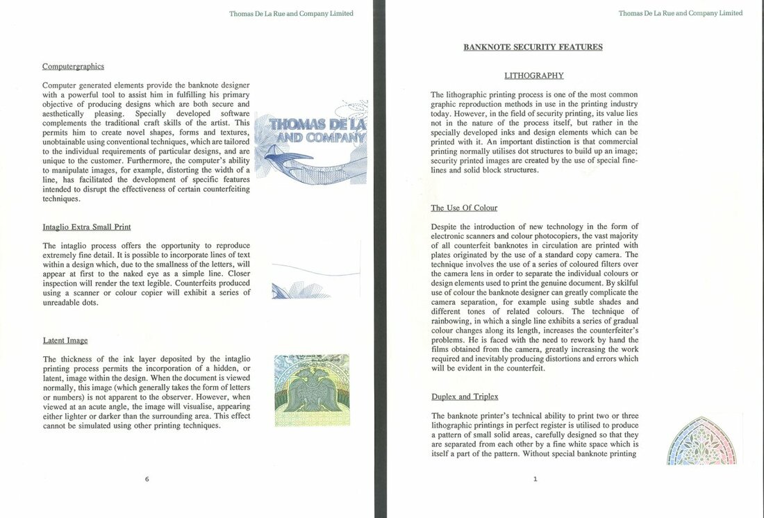 De la Rue Banknote Security Features, folder with Kenyan coat of arms on the cover, 13 pages with samples of De La Rue banknotes security features ca.1992