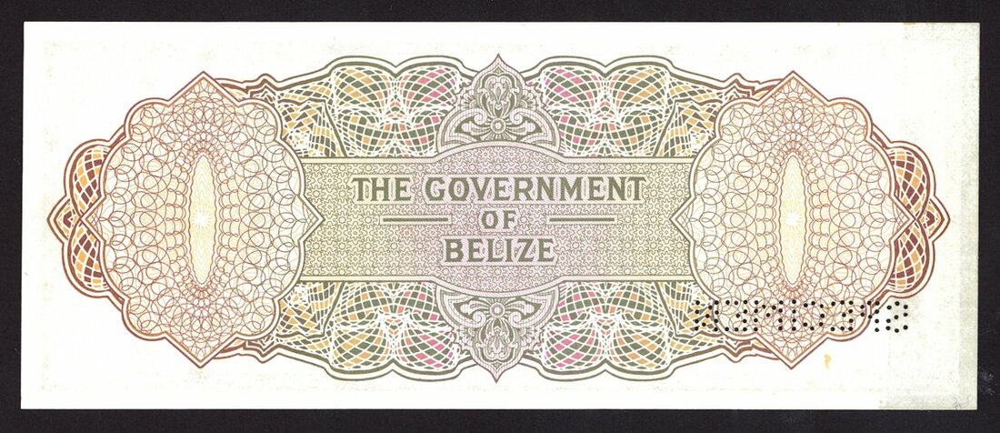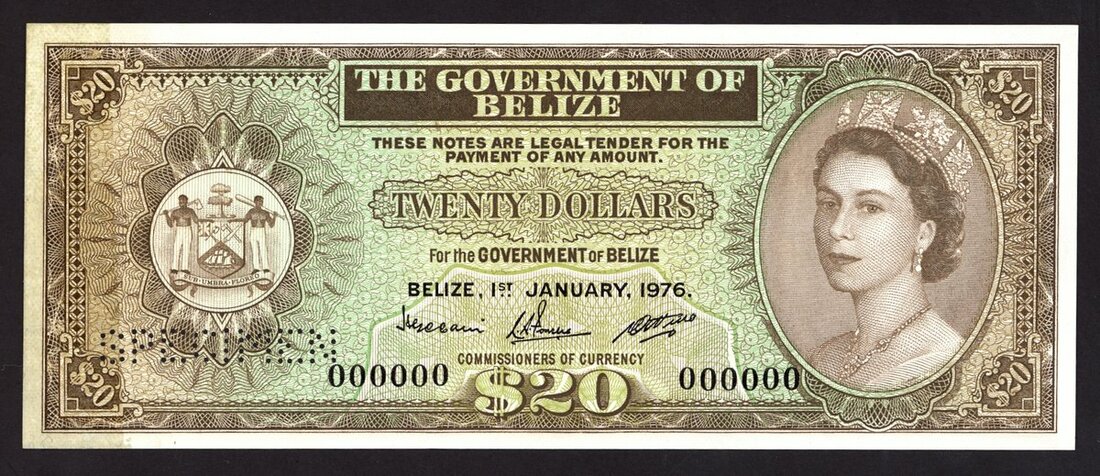 Government of Belize, specimen 20 dollars,. 1 January 1976, serial number 000000, brown and green, Elizabeth II at right, arms at left, signatures of Cain, Fonseca and Cattouse