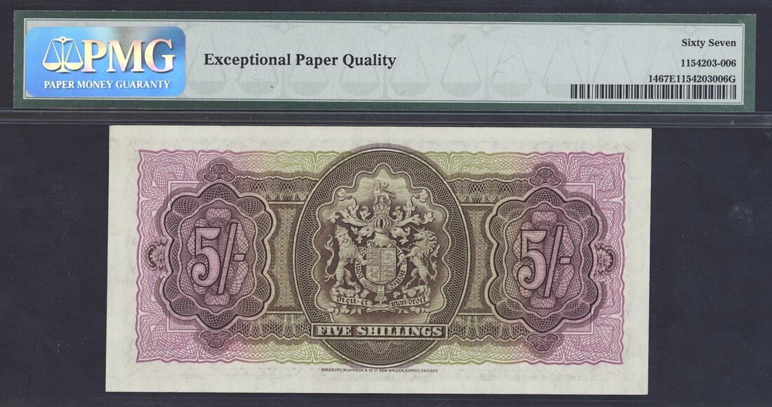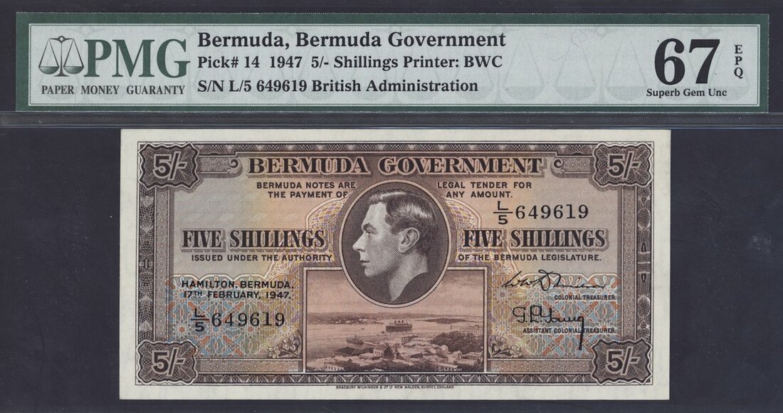 (x) Bermuda Government, 5 shillings 1947, serial number L/5 649619, (Pick 14), PMG Top Pop, 67 EPQ Superb Gem Uncirculated