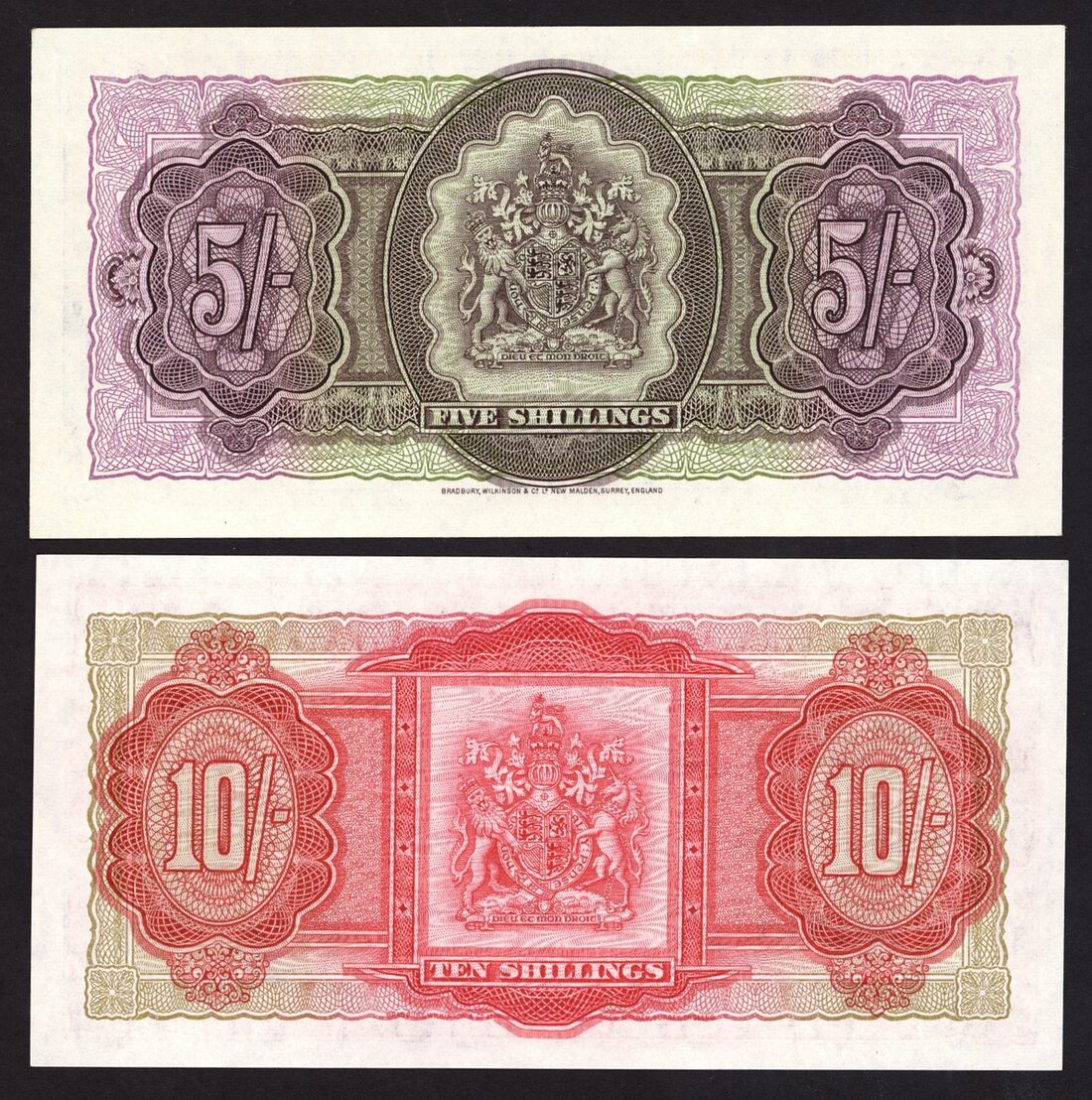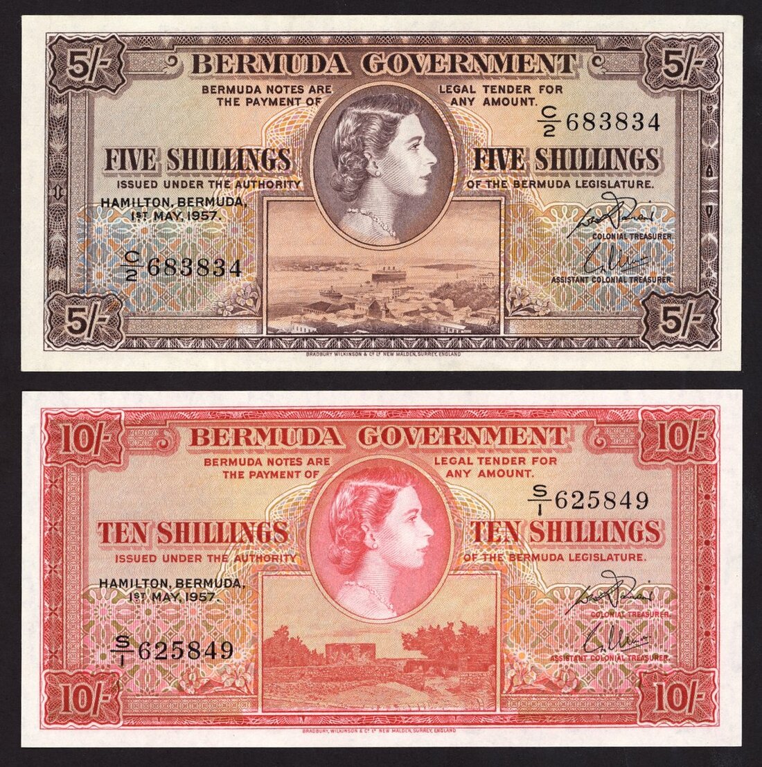 Bermuda Government, 5/-, 10/-, 1957, prefixes C/2, S/1, (Pick 18b, 19b, TBB B119b, B120b), uncirculated (2 notes)