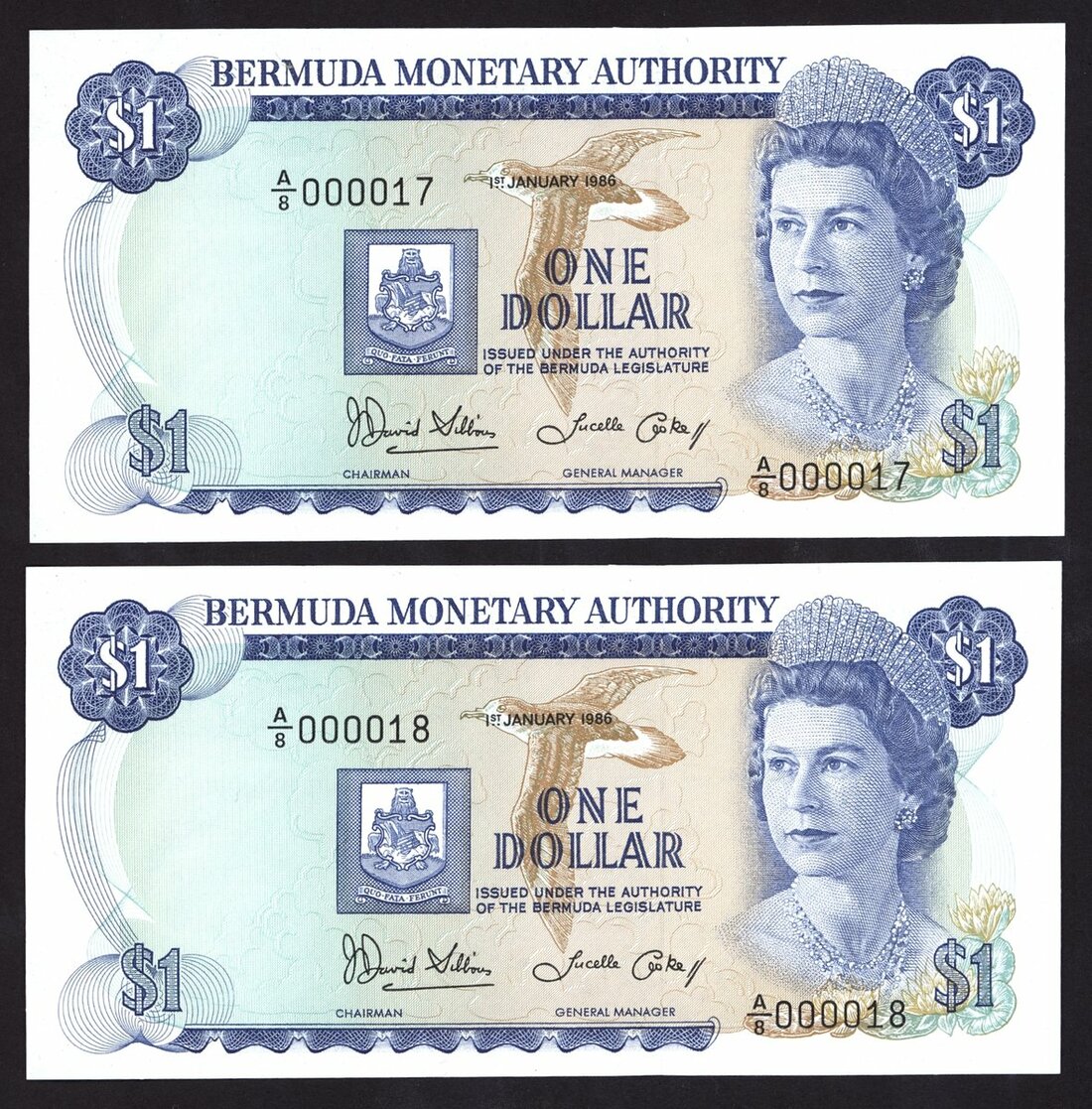 (x) Bermuda Monetary Authority, consecutive pair $1 (2), 1986, serial numbers A/8 000017/18, (Pick 28, TBB B201), uncirculated (2 notes)
