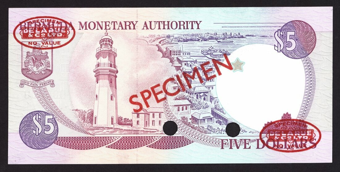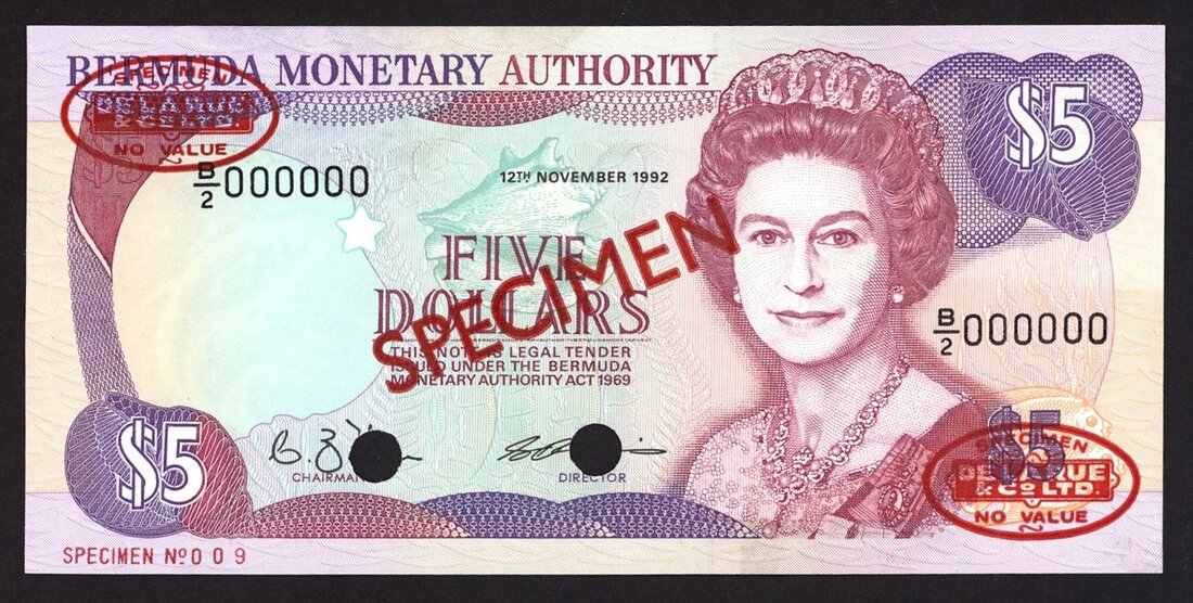Bermuda Monetary Authority, specimen $5, 12 November 1992, serial number B/2 000000, red-violet and purple on multicoloured underprint, Queen Elizabeth II at right, signatures of Mann and Richards, reverse lighthouse