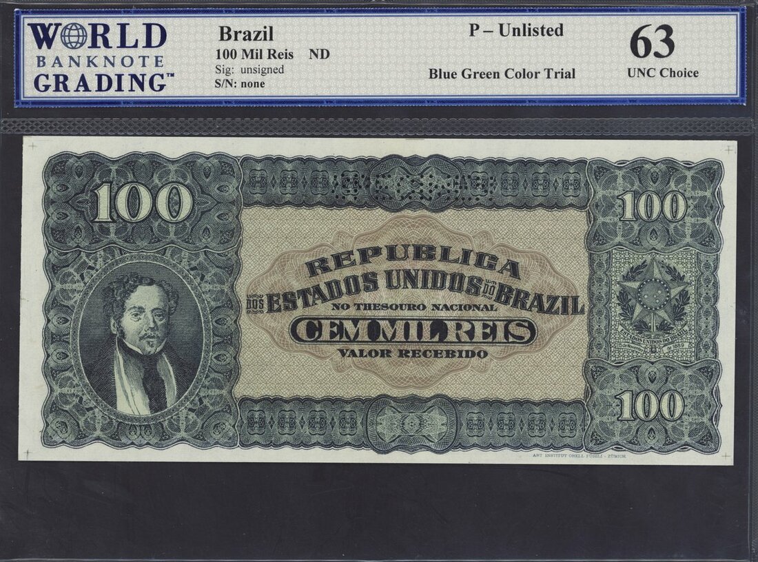 (x) Brazil, Colour Trial Specimen 100 mil reis, (Pick Unlisted), in WBG holder 63 UNC Choice, rare