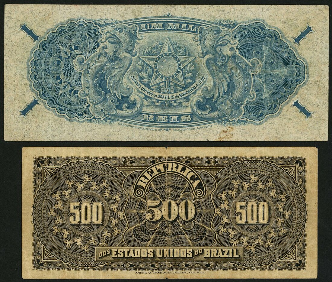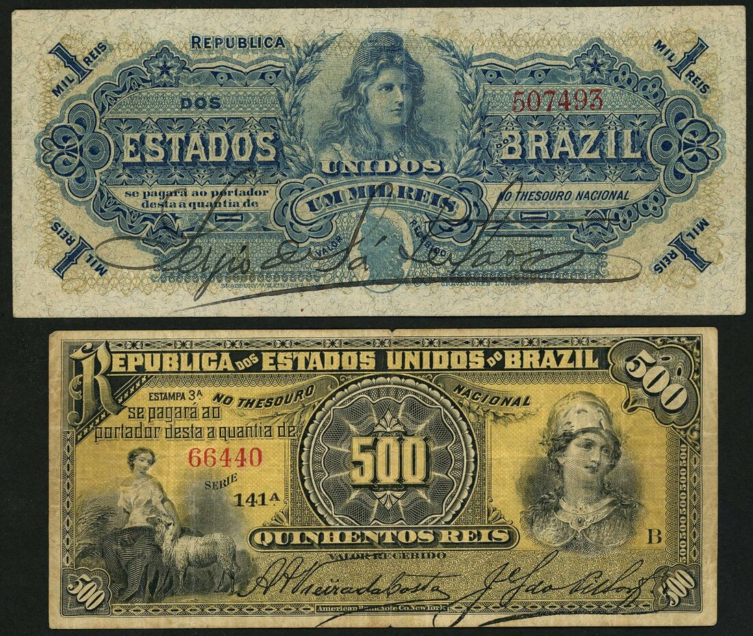Republica dos Estados Unidos do Brasil, 500 reis, ND (1883), red serial number 66440, black and yellow, woman and sheep at left, Minerva at right, 1 mil reis, ND (1902), red serial number 507493, blue, head of Liberty at centre