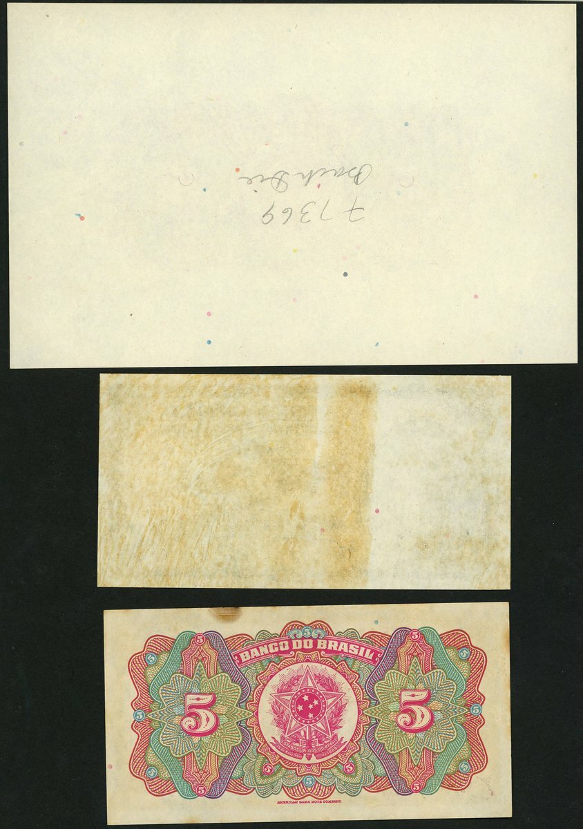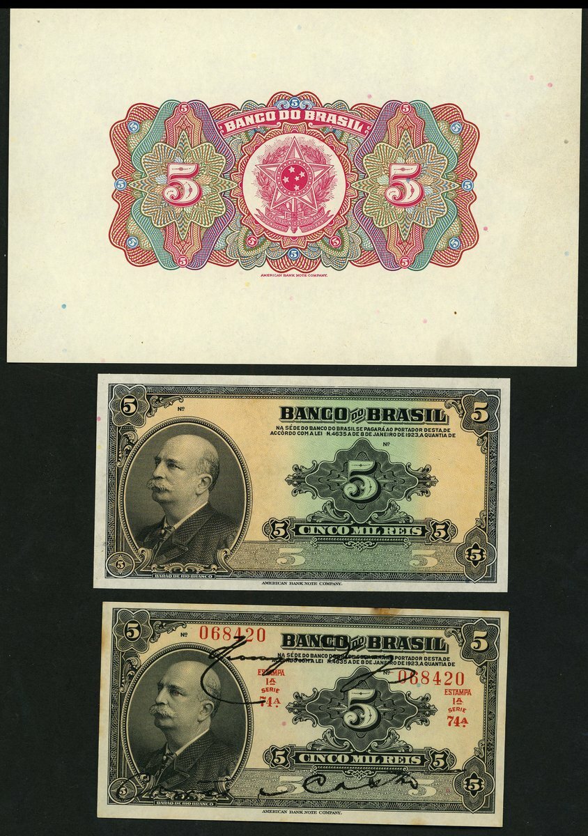 Banco do Brasil. 5 mil reis, Estampa 1A, black and pale yellow, Branco at left, also an obverse and reverse proof 5 mil reis for the same issue