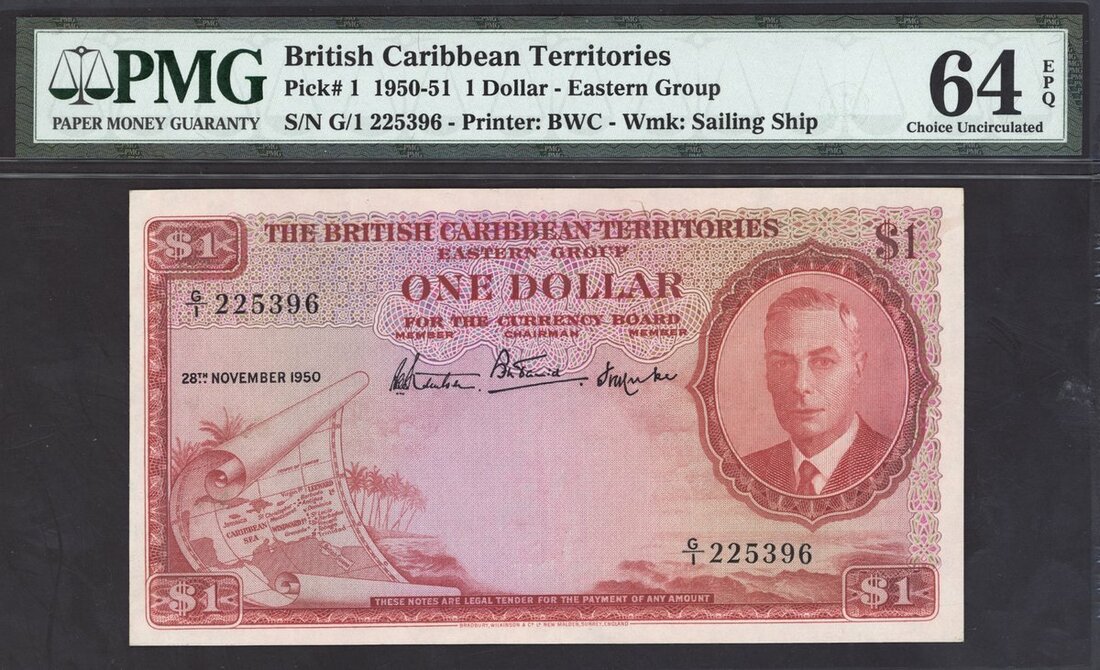 (x) British Caribbean Territories, 1 dollar, 28 November 1950, serial number G/1 225396, (Pick 1), in PMG holder 64 EPQ Choice Uncirculated, second highest grade with only 4 notes in a higher grade on PMG Census, first issue for British Caribbean Currency Board, and very high grade for type