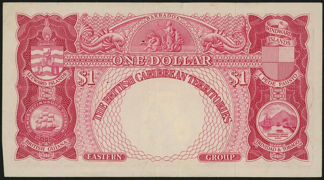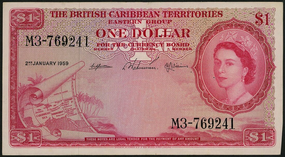 British Caribbean Territories, $1, 2 January 1959, serial number M3-769241, (Pick 7a, TBB B107g), pinholes, very fine