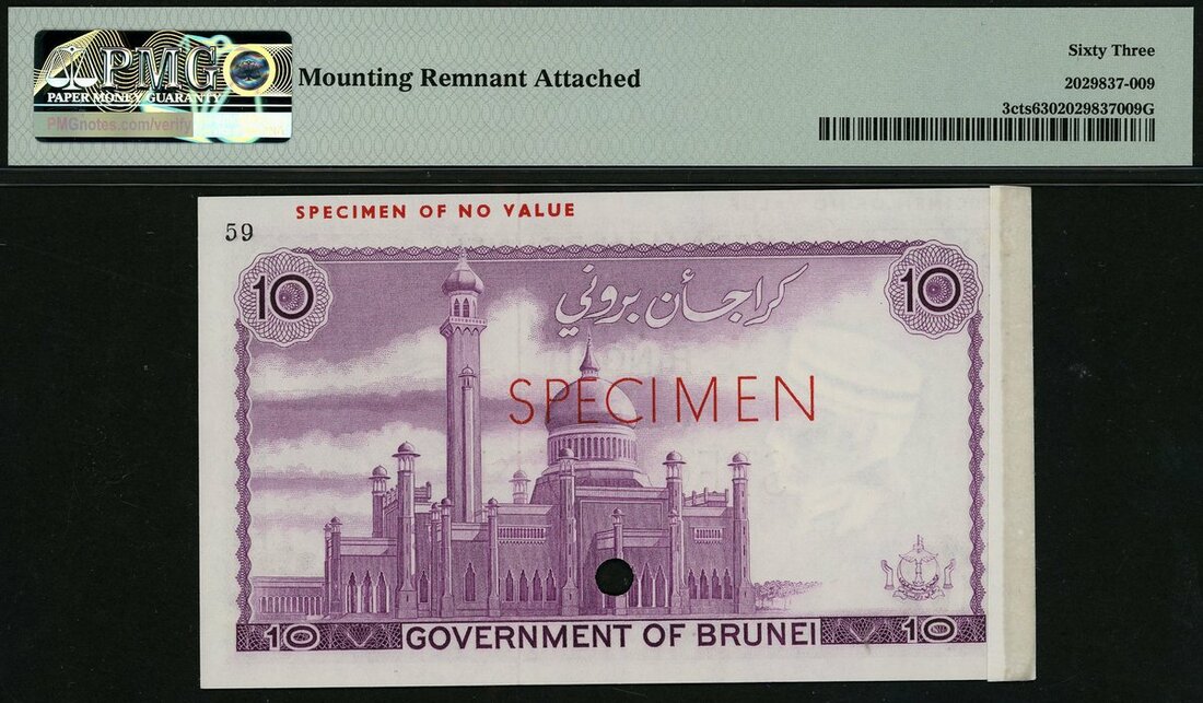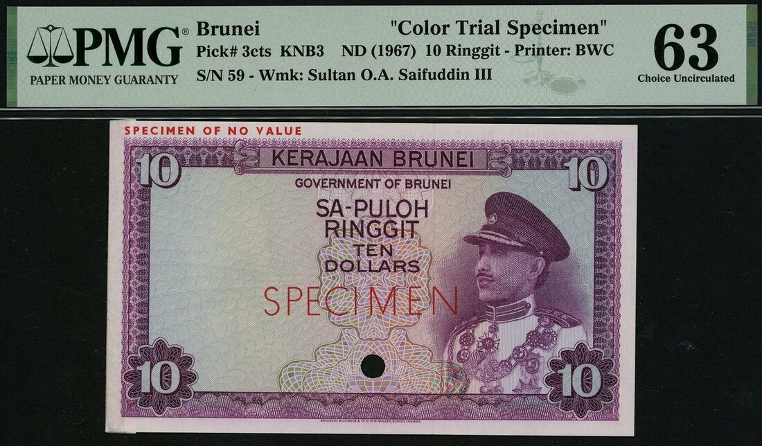 Government of Brunei, Colour Trial Specimen 10 ringgit, ND (1967), purple and multicolour (issued in red), Sultan Omar Ali Saifuddin III wearing uniform at right wearing uniform at right, reverse, Omar Ali Saifuddin mosque in Bandar Seri Begawan