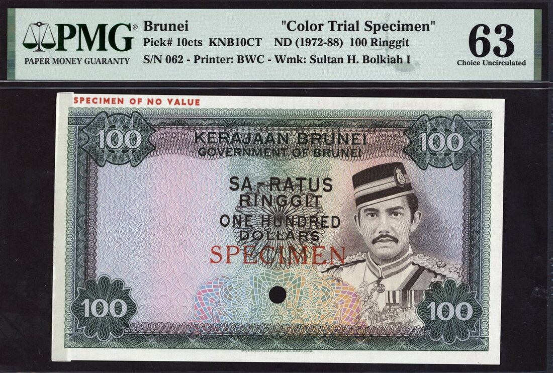 Government of Brunei, Colour Trial Specimen 100 ringgit, ND (1972-88), green and multicolour (issued blue and purple), Sultan Hassanal Bolkiah Mu'izzaddin Waddaulah wearing uniform and songkok headgear at right, reverse, Omar Ali Saifuddin mosque in Bandar Seri Begawan