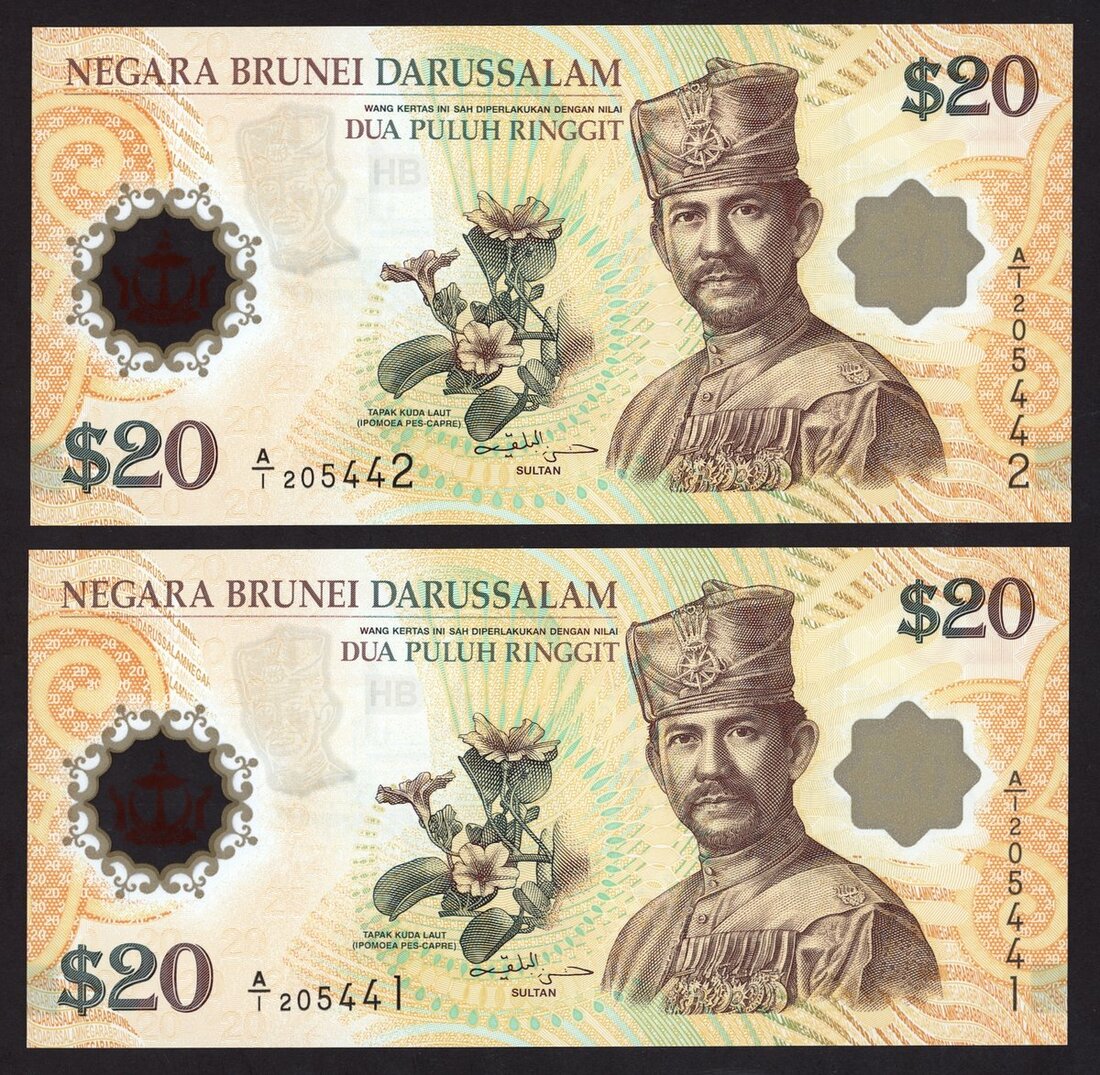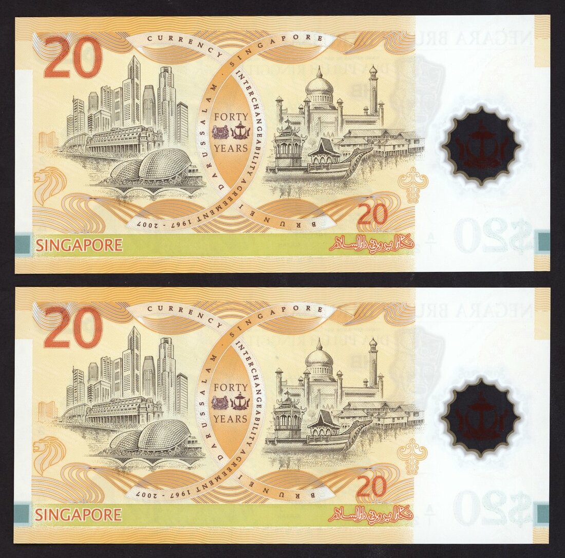 Brunei consecutive commemorative issue $20, (ND 2007), (Pick 34a, TBB B206), celebrating currency interchangeability agreement between Brunei and Singapore (2 notes)