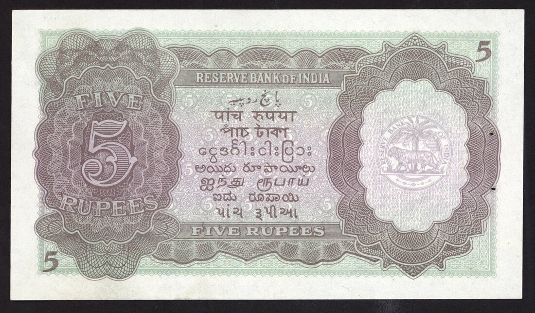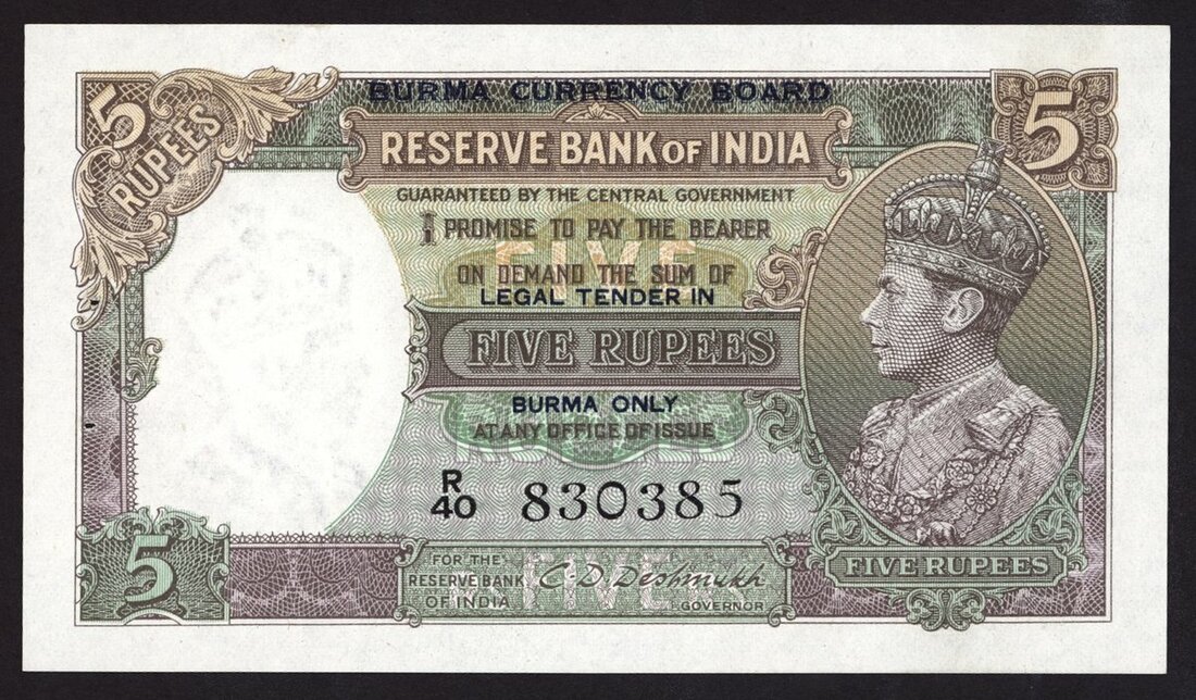 Burma Currency Board, overprint on India 5 rupees, ND (1947), serial number R/40 830385, (Pick 31, TBB B602), usual pinholes at left, tiny spot at left margin, otherwise uncirculated.