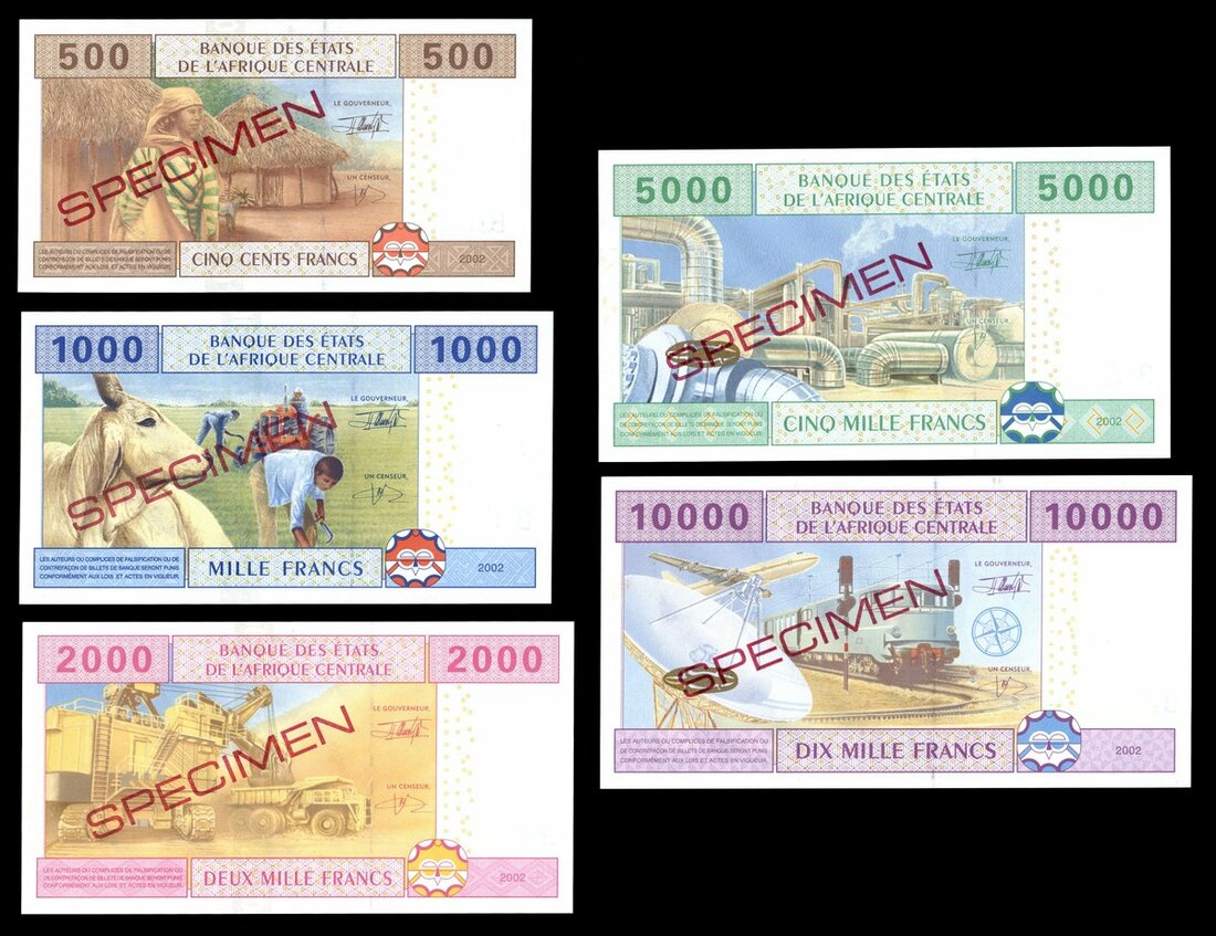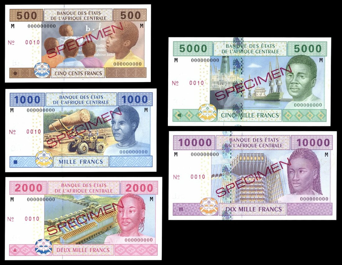Central African States, (CAR), same number specimen set, 500 francs, 1000 francs, 2000 francs, 5000 francs, 10000 francs, prefix M number10, (Pick 306Ms, 307Ms, 308Ms, 309Ms, 310Ms, TBB B106Ms, 107Ms, 108Ms, 109Ms, 110Ms) very interesting and unusual to find as a specimen set, minor spotting on some, otherwise about uncirculated to uncirculated (5 notes)