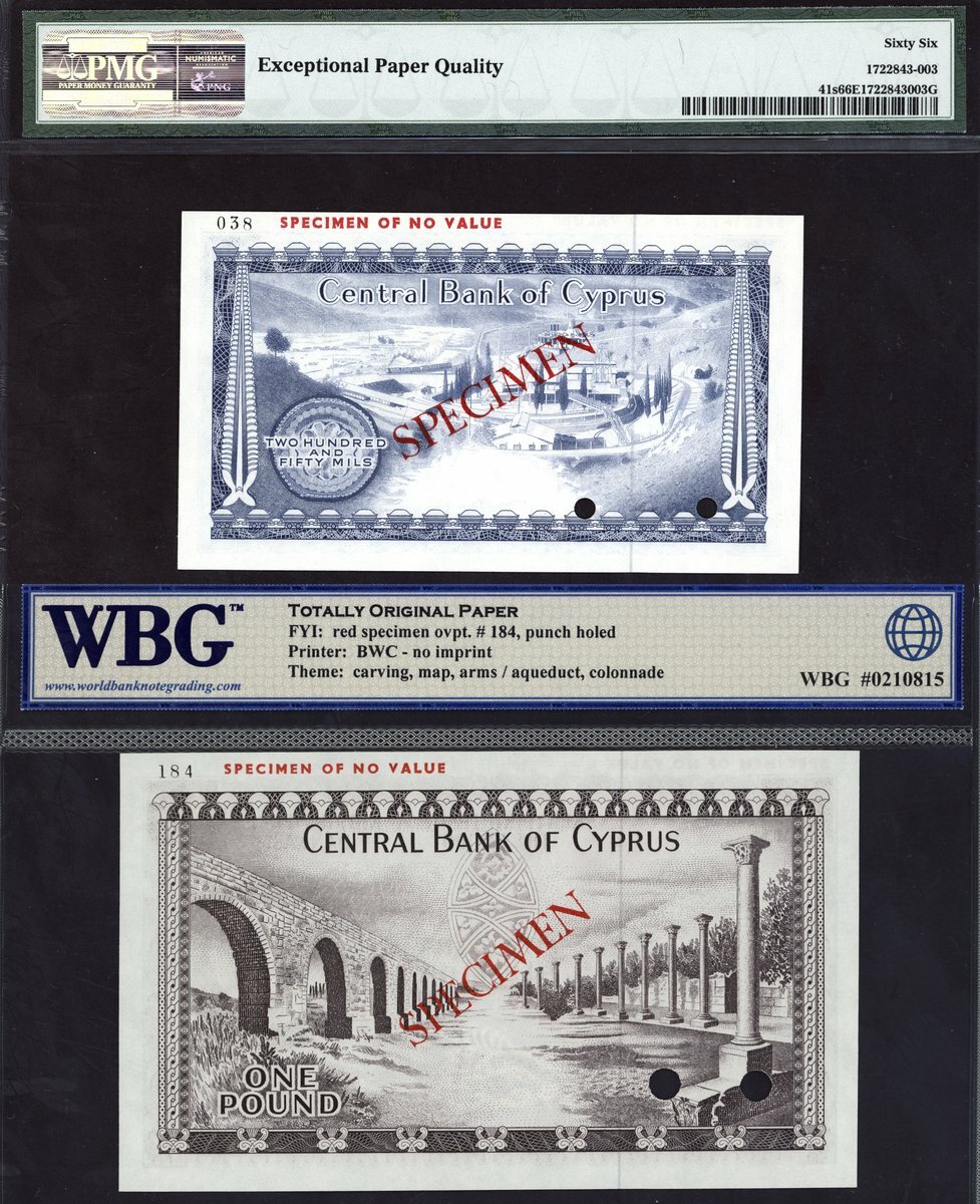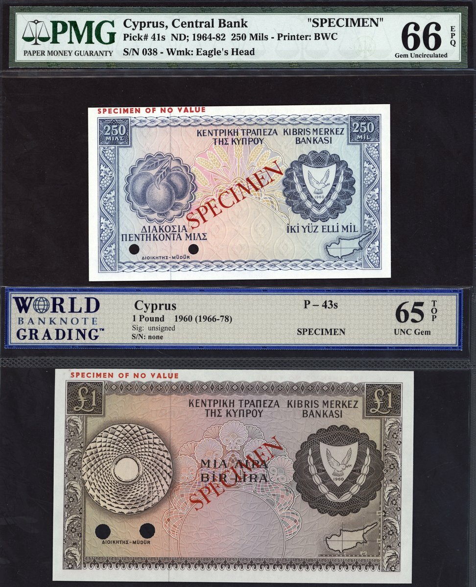 (x) Central Bank of Cyprus, specimen £1 1960, also including 250 mils, (1964-82),
