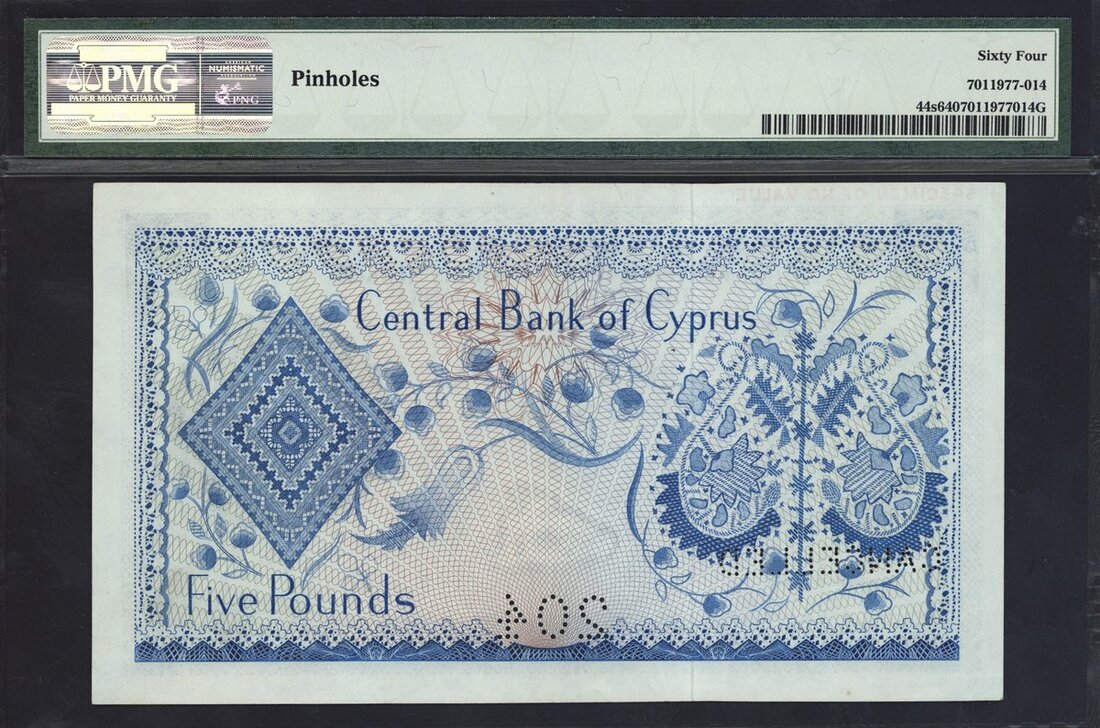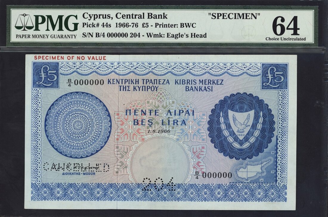 Central Bank of Cyprus, specimen £5, 1966-76, serial number 000000 204, (Pick 44s, TBB B304s), in PMG holder 64 Choice Uncirculated, pinholes