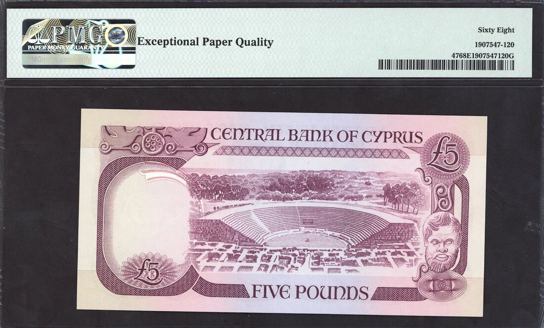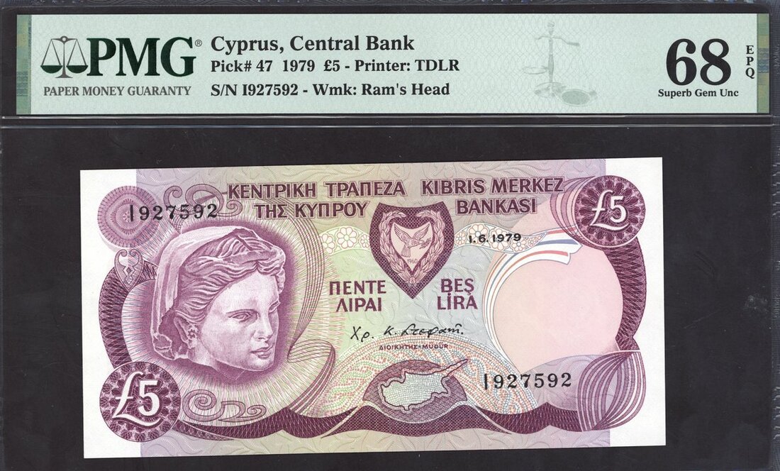 (x) Central Bank of Cyprus, £5, 1 June 1979, serial number 1927592, (Pick 47), PMG Top Pop, 68 EPQ Superb Gem Uncirculated, very high grade
