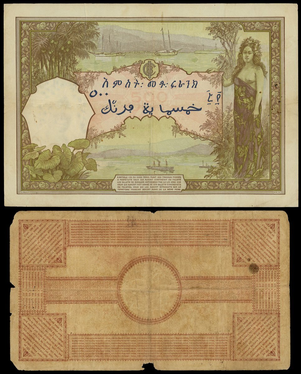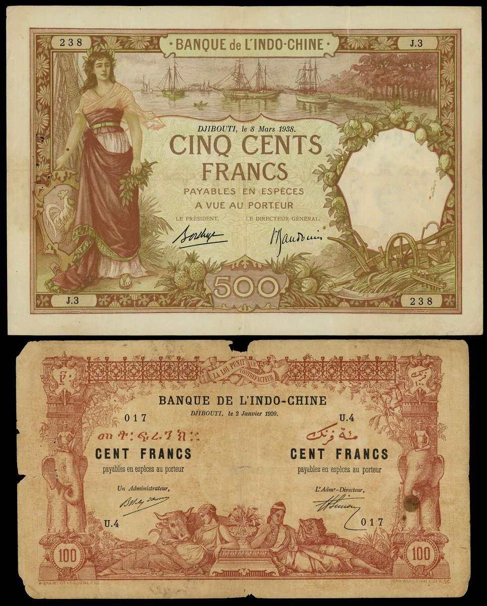 Banque de l'Indo-Chine, Djibouti, 500 francs, 8 March 1938, serial number J.3-238, purple and pale green, France at left, ships and allegorical scenes in field, signature of Borduge and Baudouin, also 100 francs, 1920, d'Oissell and Simon signatures