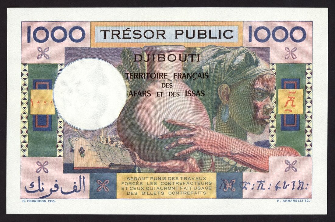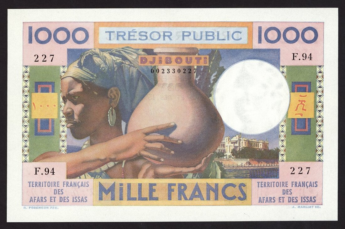 Tresor Public, Territoire Français des Afars et des Issas, 1000 Francs, ND (1974), serial number F.94-227, pink, yellow and blue multicolour, woman holding a jug at centre left, waterfront palace at lower right, Djibouti in field top centre, reverse woman holding jug at centre right, ship at lower left,