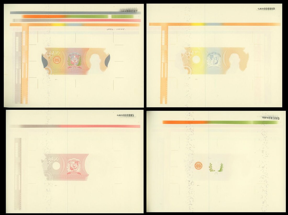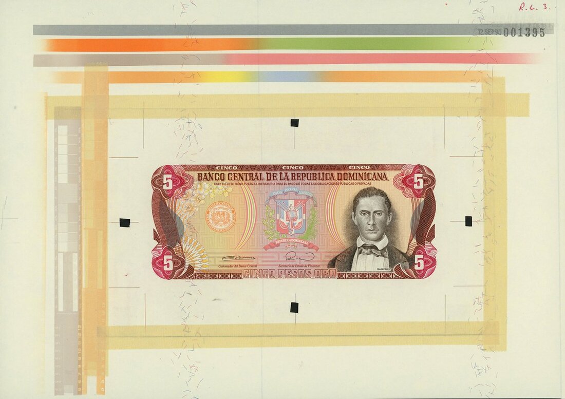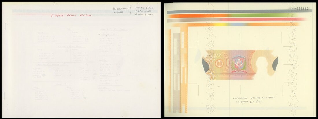 Banco Central de la Republica Dominicana, a group of progressive proofs for 5 pesos oro, 1990 including a booklet of the 1st proofs (7 obverse, 3 reverse) and colour specifications, a booklets of obverse proofs with revisions (6), including a full printed uniface obverse proof,