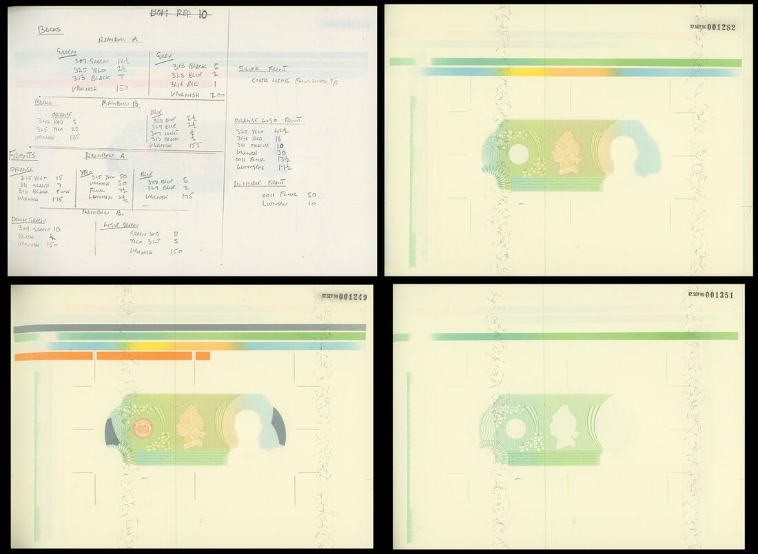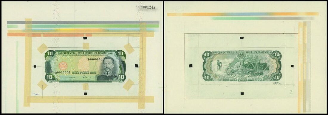 Banco Central de la Republica Dominicana, progressive proofs for a 10 pesos oro, 1990, including a booklet of 7 obverse and 3 reverse proofs with colour specifications, also 2 fully printed proofs,