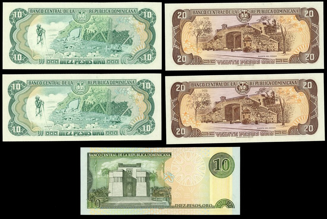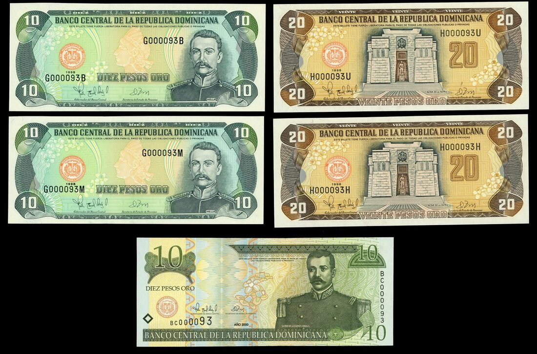 Central Bank, Dominican Republic, 10 pesos (3), 20 pesos (2), 1998/2000, all serial number 000093, (Pick 153, 159, 154), uncirculated (5)