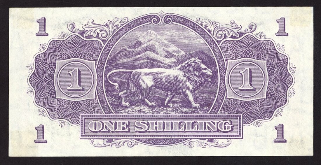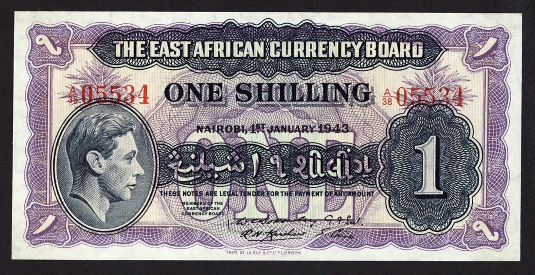 East African Currency Board, 1 shilling, 1 January 1943, serial number A/38 05534. (Pick 27, TBB B216), faint tape residue at reverse four corners, about uncirculated, lovely example