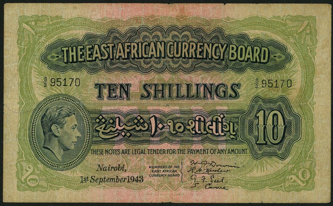 East African Currency Board, 10 shillings, 1 September 1943, prefix S/3, green and lilac, head of George VI at left, value at right, signatures of Downie, Kershaw, Seel and Caine